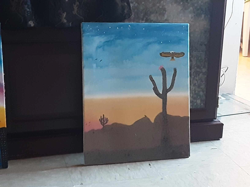 Canvas painting. Features a desert scene with a saguaro cactus and a bird. Sunset colors.