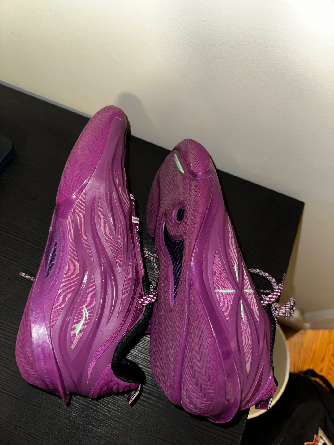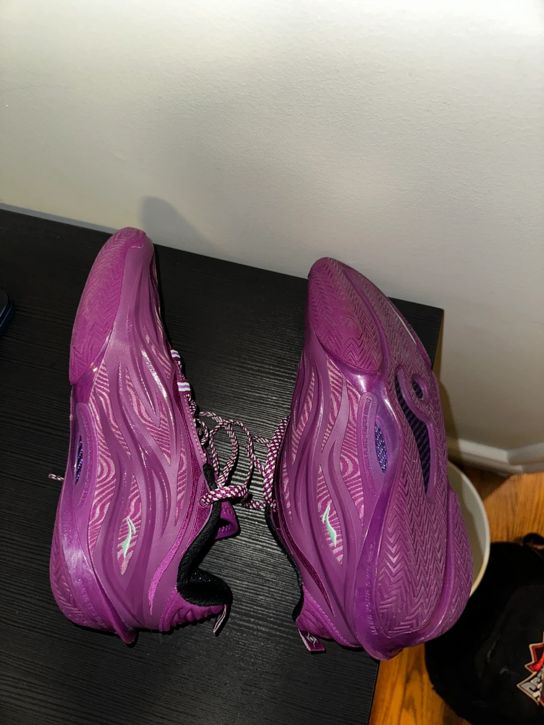 A pair of Li-Ning basketball shoes in a vibrant purple colour. They feature a durable design for performance on the court. These shoes are great for any basketball enthusiast looking for stylish and functional footwear.