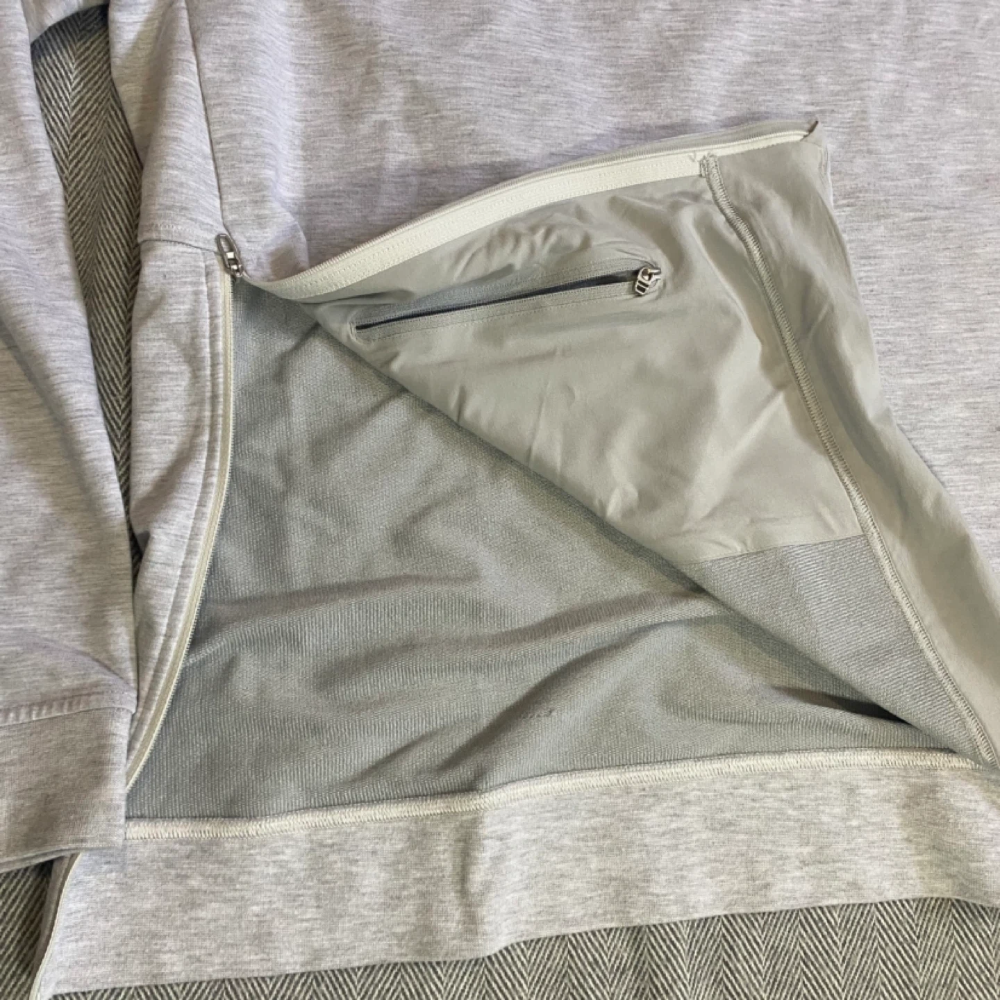This Lululemon “City Sweat” crewneck sweatshirt is a size Large. It's made with a blend of 57% polyester, 42% cotton, and 6% Lycra elastane. Features a zippered side pocket.