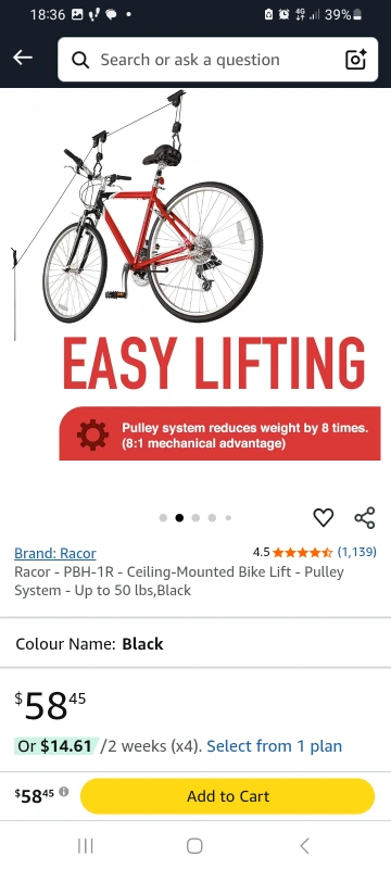 Racor - PBH-1R - Ceiling-Mounted Bike Lift - Pulley System - Up to 50 lbs,Black