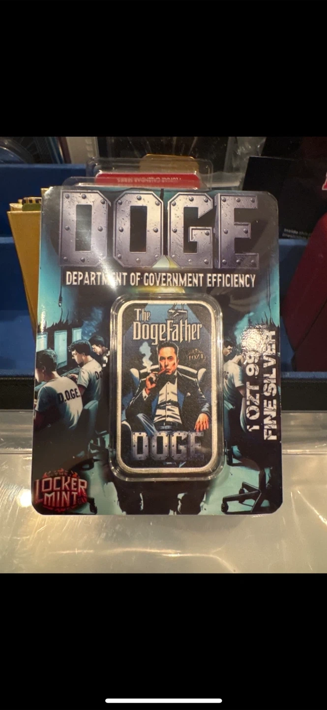 3/3 This is a 1 oz fine silver bar from Locker Mint, featuring "The Dogefather" design. It's packaged for display. Makes a neat collectible for crypto or silver enthusiasts!
