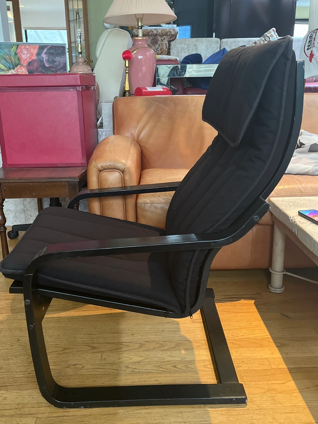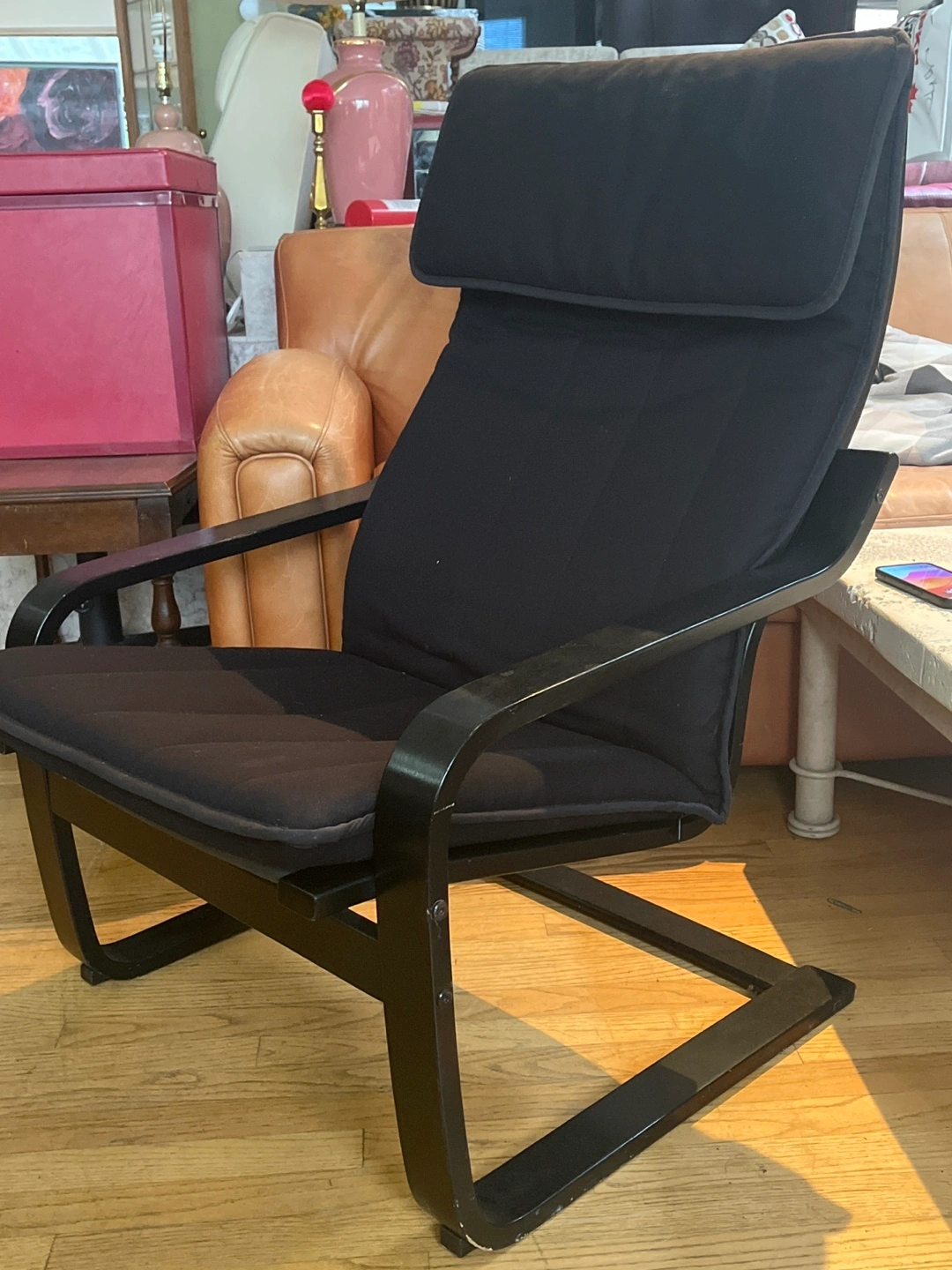 Chair with black upholstery. The chair has a curved wooden frame. Perfect for relaxing with a good book.