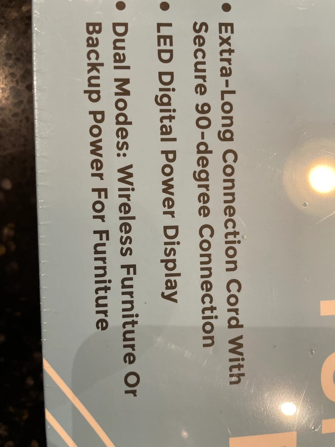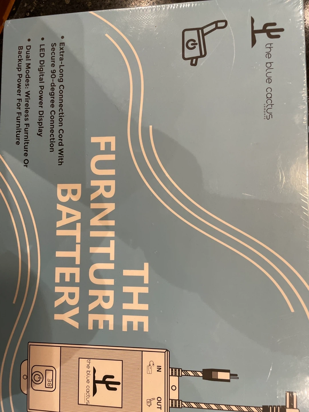 Selling a brand new The Blue Cactus Furniture Battery! It features an extra-long connection cord with a secure 90-degree connection and an LED digital power display. It also has dual modes: wireless furniture or backup power for furniture