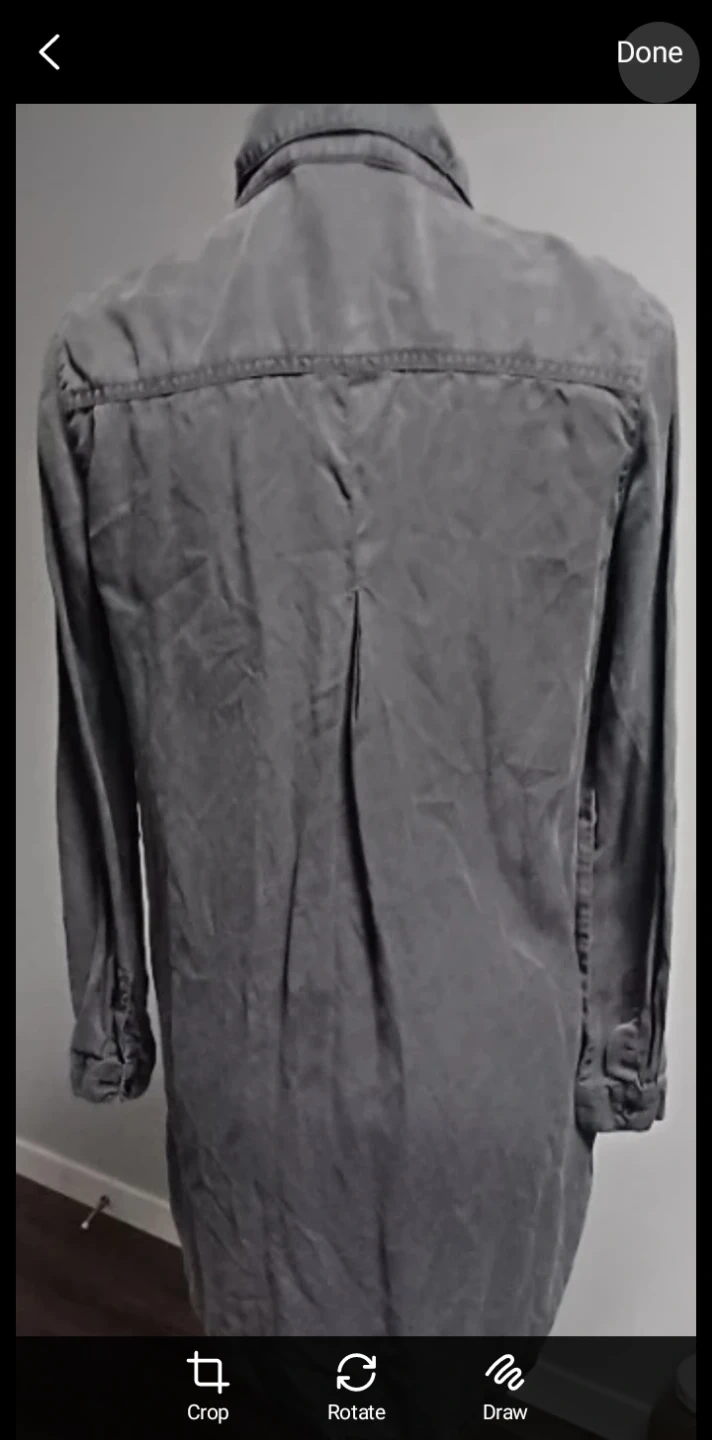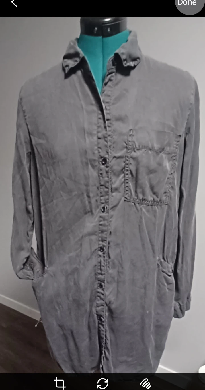 This is a grey, long-sleeved button-up shirt dress. It has a collared neckline, breast pocket details and two side front pockets. Comfortable and can be worn open as a long jacket for summer.
