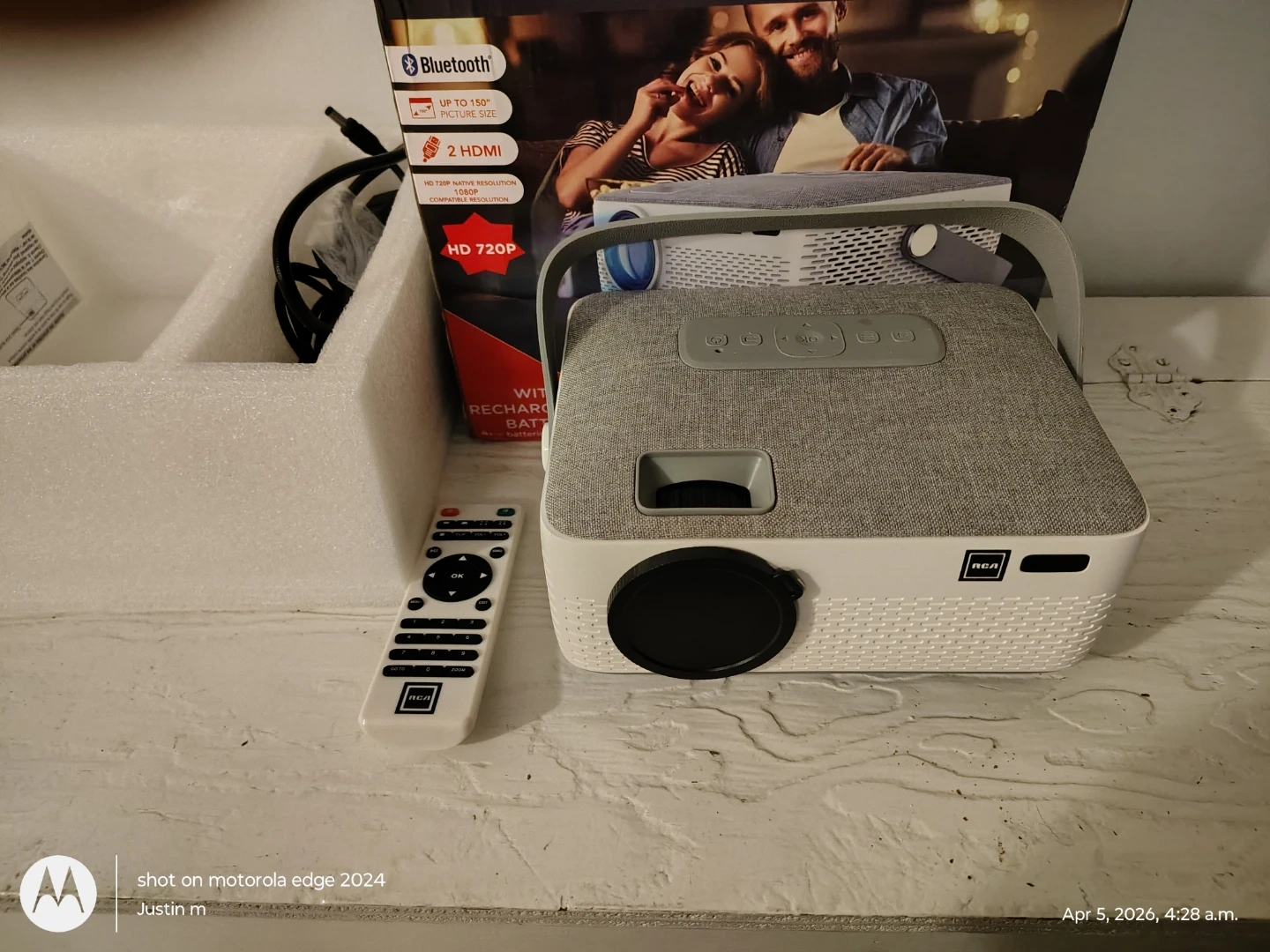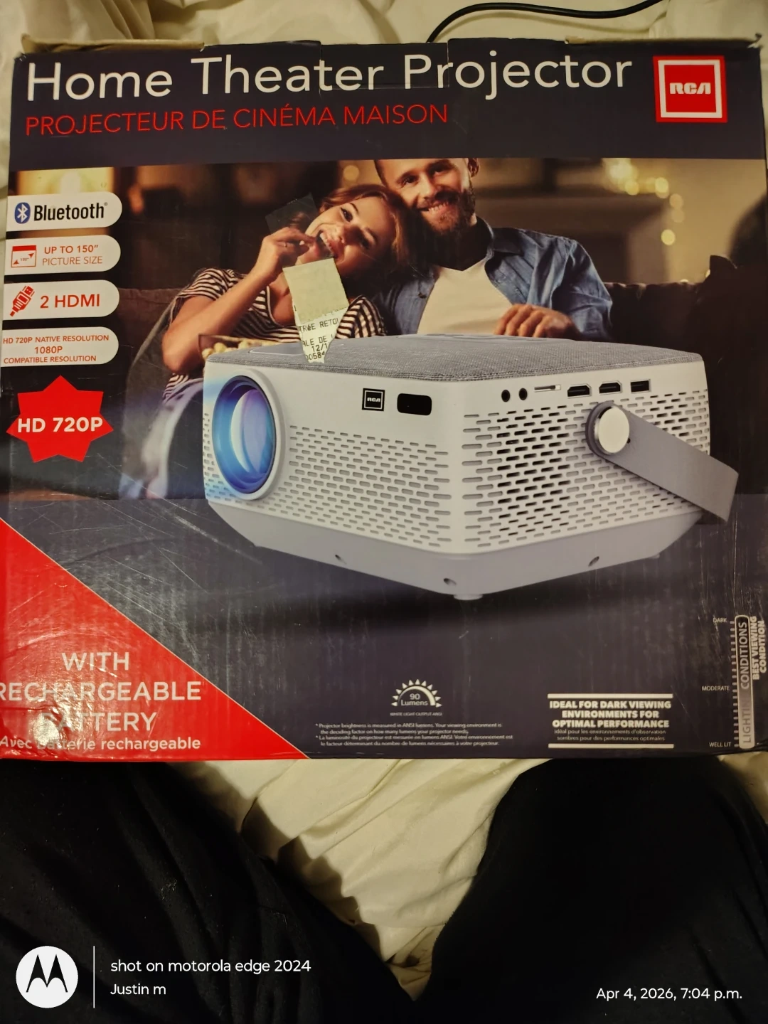 This RCA Home Theater Projector has a rechargeable battery. It supports up to a 150" picture size and HD 720p native resolution with 1080p compatible resolution. It comes with 2 HDMI ports and Bluetooth connectivity. Ideal for dark viewing environments for optimal performance.