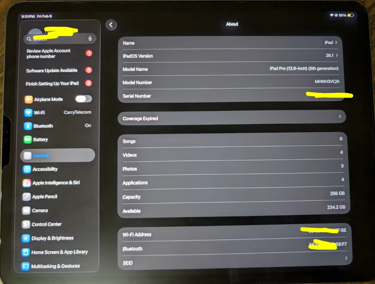 This is an iPad Pro (12.9-inch) 5th generation model. It has 256 GB of storage capacity and runs on iPadOS 26.1. Includes Wi-Fi and Bluetooth connectivity.
