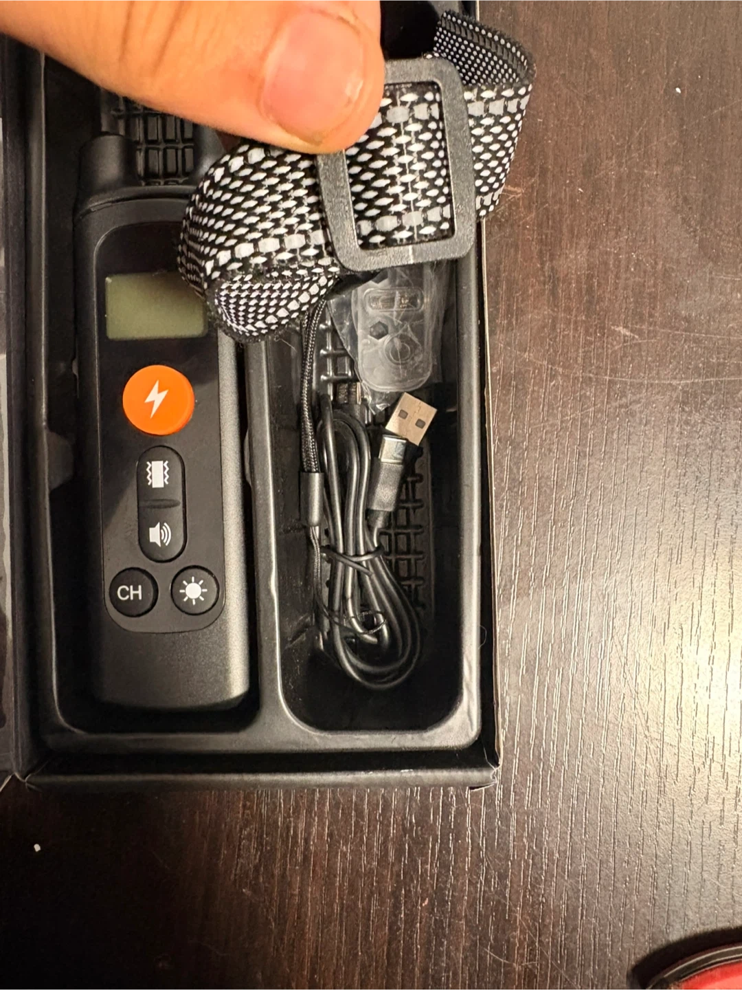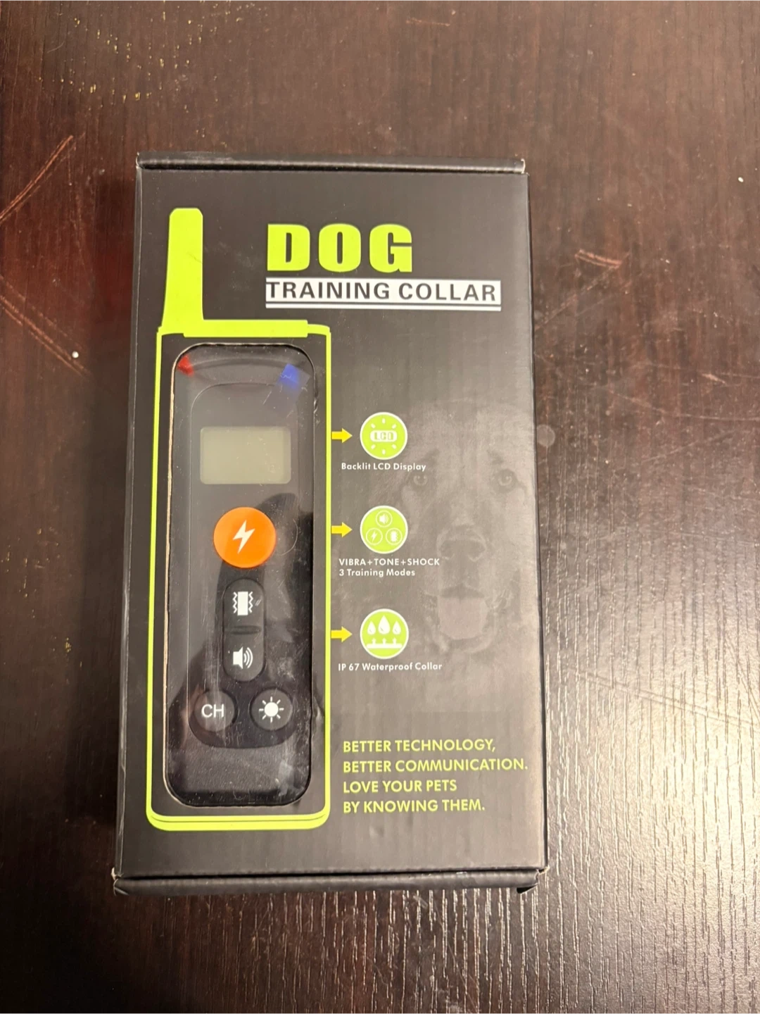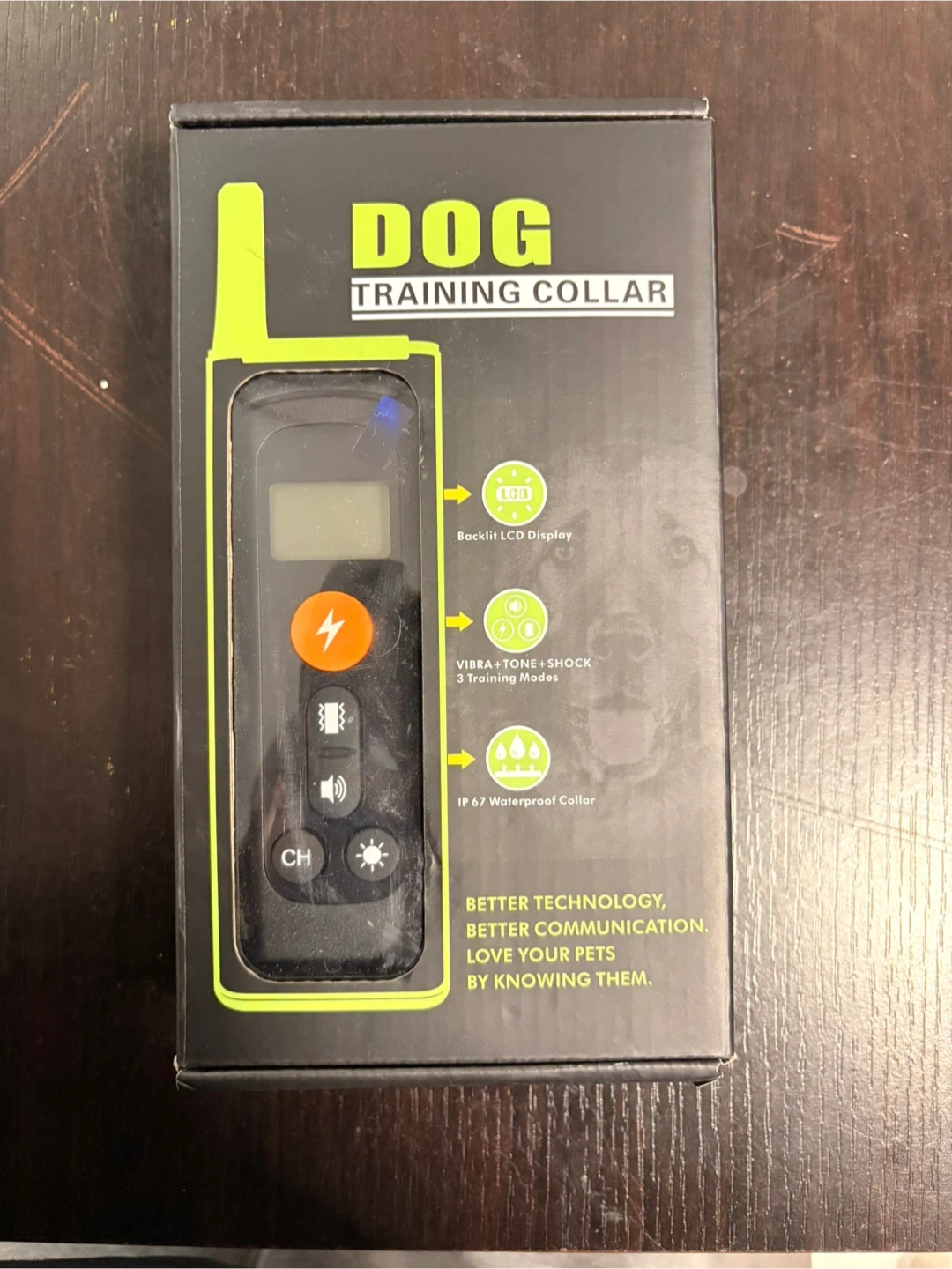 This dog training collar features a backlit LCD display and 3 training modes: vibration, tone, and shock. It's IP67 waterproof. Included is the collar, remote, and USB charging cable.