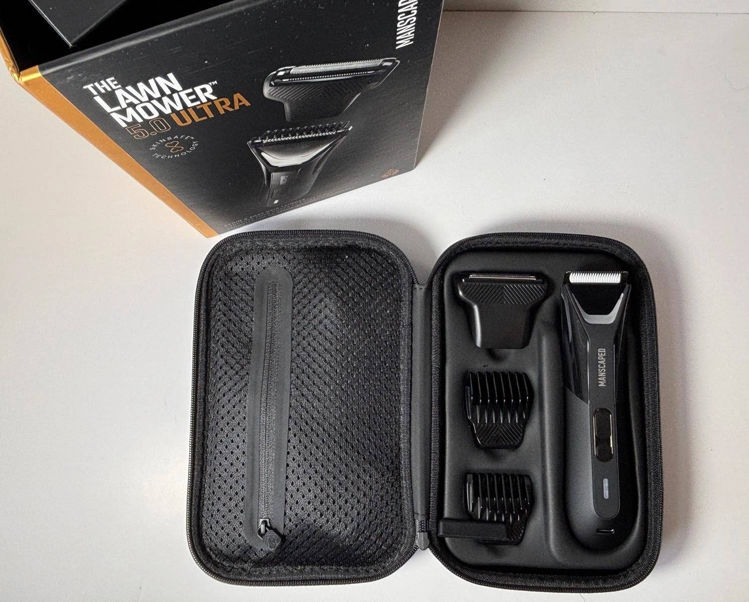 About this item: THE LAWN MOWER 5.0 ULTRA: The ultimate groin & body hair trimmer made specifically for men. Includes two Interchangeable SkinSafe Blade Heads: A Trimmer Blade & Foil Blade. One fixed-length comb at 1.4mm and two adjustable combs ranging from 2-12mm, power adapter, USB-C cable, and a travel pouch. Our trimmer is USB-C and wireless charging compatible.