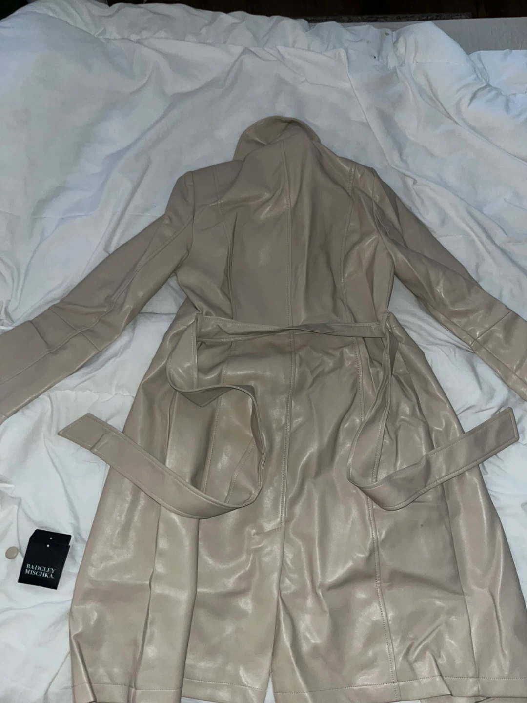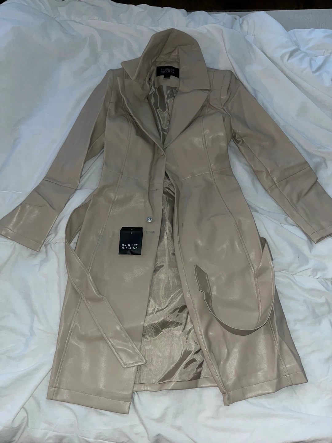 Beige faux leather trench coat by Badgley Mischka. Features a tie belt and button closure. Size S/P. Made in China. It's a stylish outerwear piece.