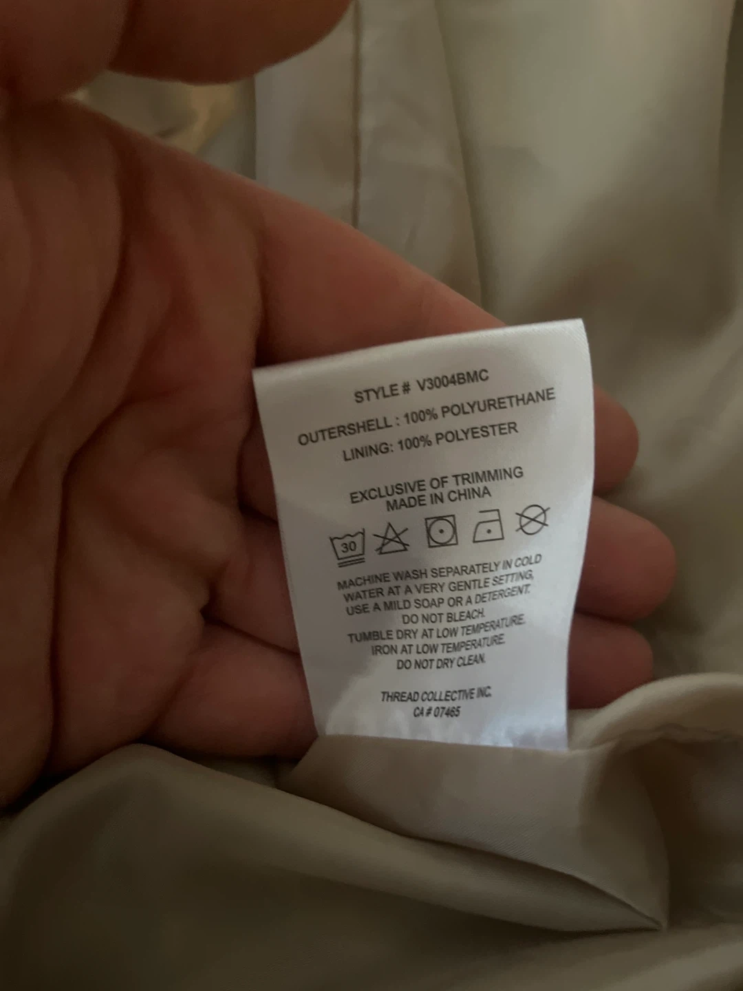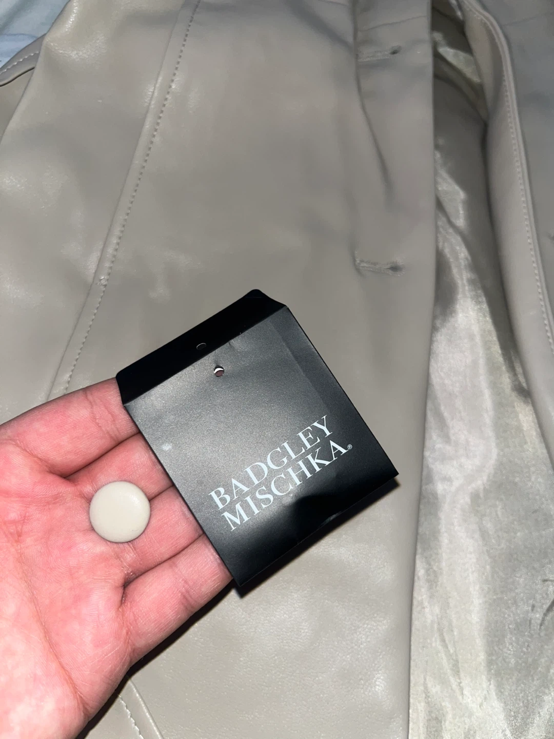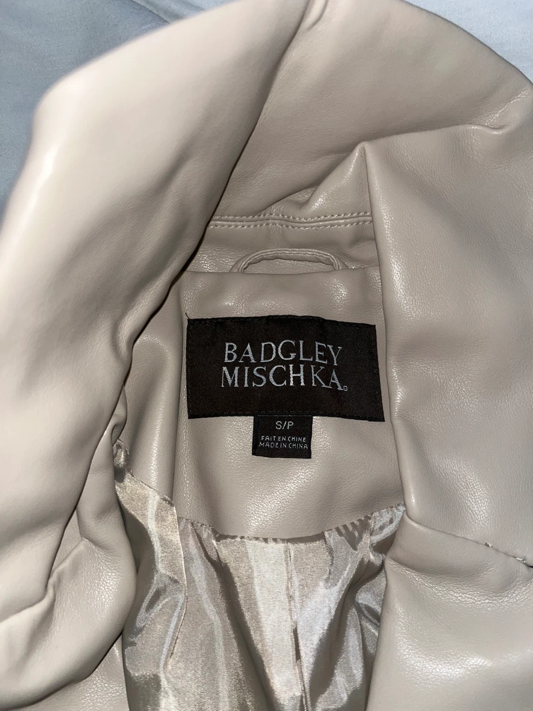 Beige faux leather trench coat by Badgley Mischka. Features a tie belt and button closure. Size S/P. Made in China. It's a stylish outerwear piece.