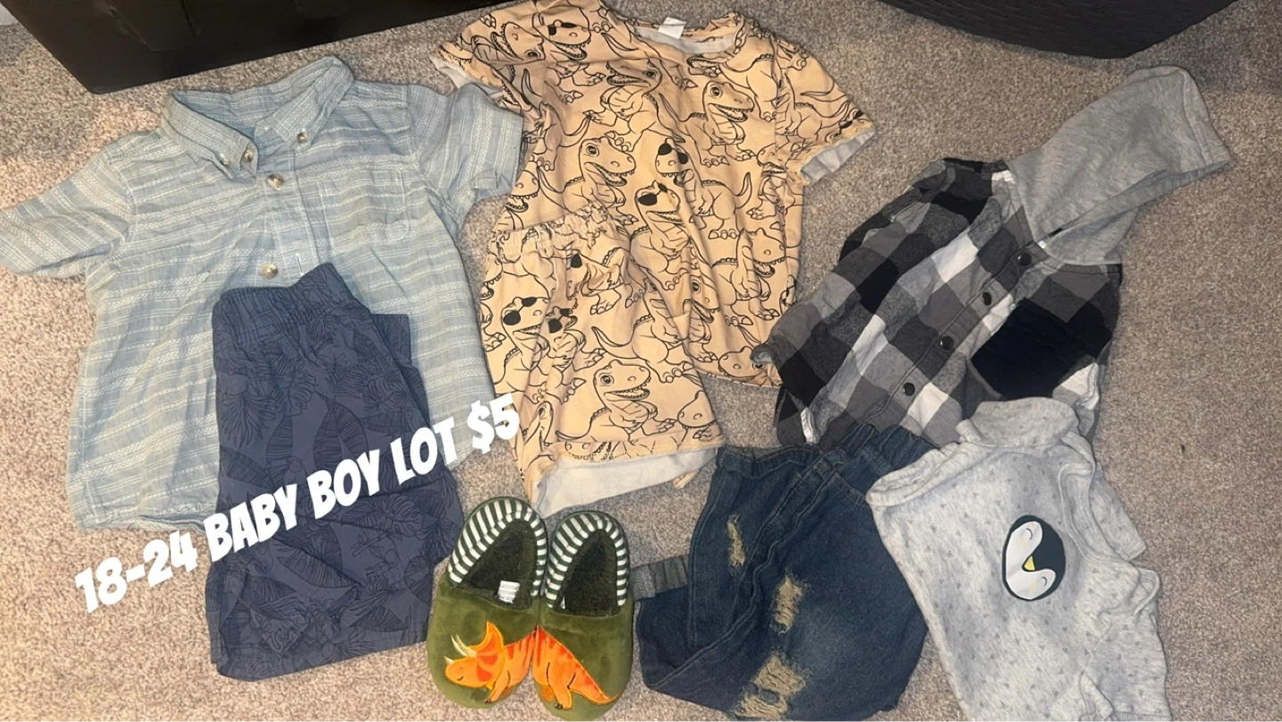 This is a lot of baby boy clothes in size 18-24 months. It includes a short-sleeve button-up shirt, a dinosaur-print t-shirt, a plaid hooded shirt, blue patterned shorts, distressed jeans, and a grey penguin bodysuit. These items are perfect for a growing toddler's wardrobe!