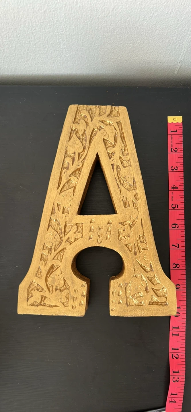 This carved wooden letter 'A' has a beautiful gold finish with intricate detailing. It's made in India. It measures approximately 8 inches tall. It's ready to hang!