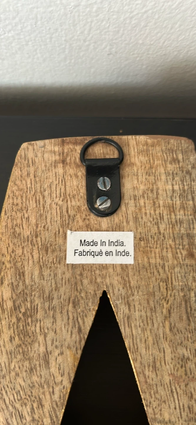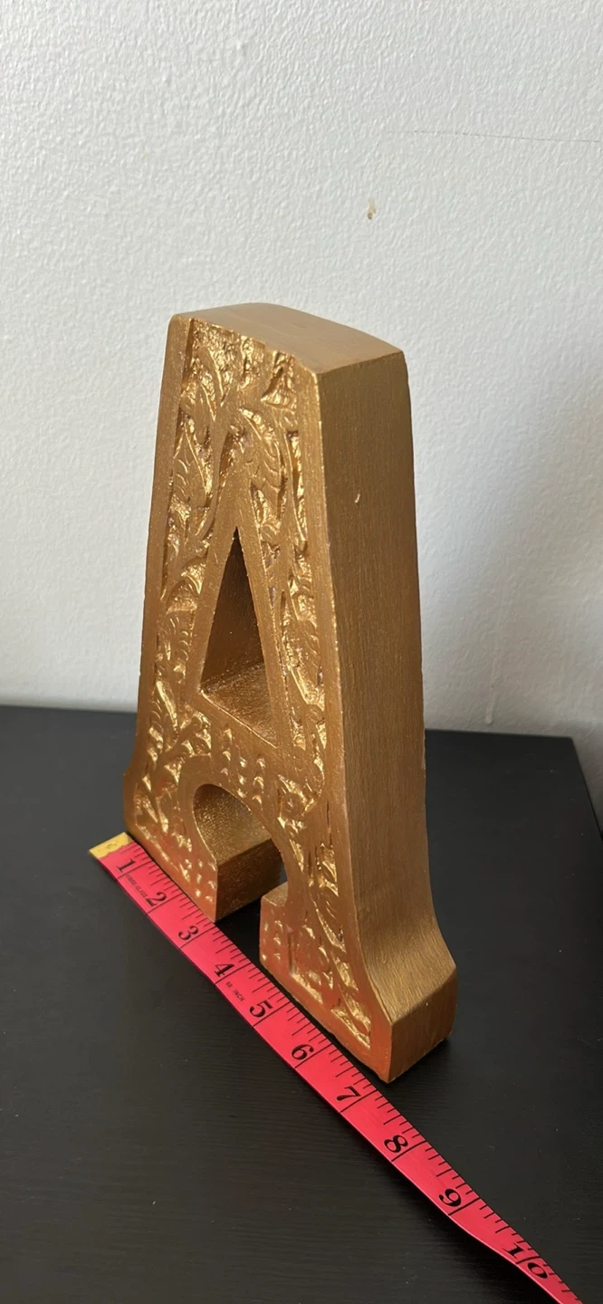 This carved wooden letter 'A' has a beautiful gold finish with intricate detailing. It's made in India. It measures approximately 8 inches tall. It's ready to hang!