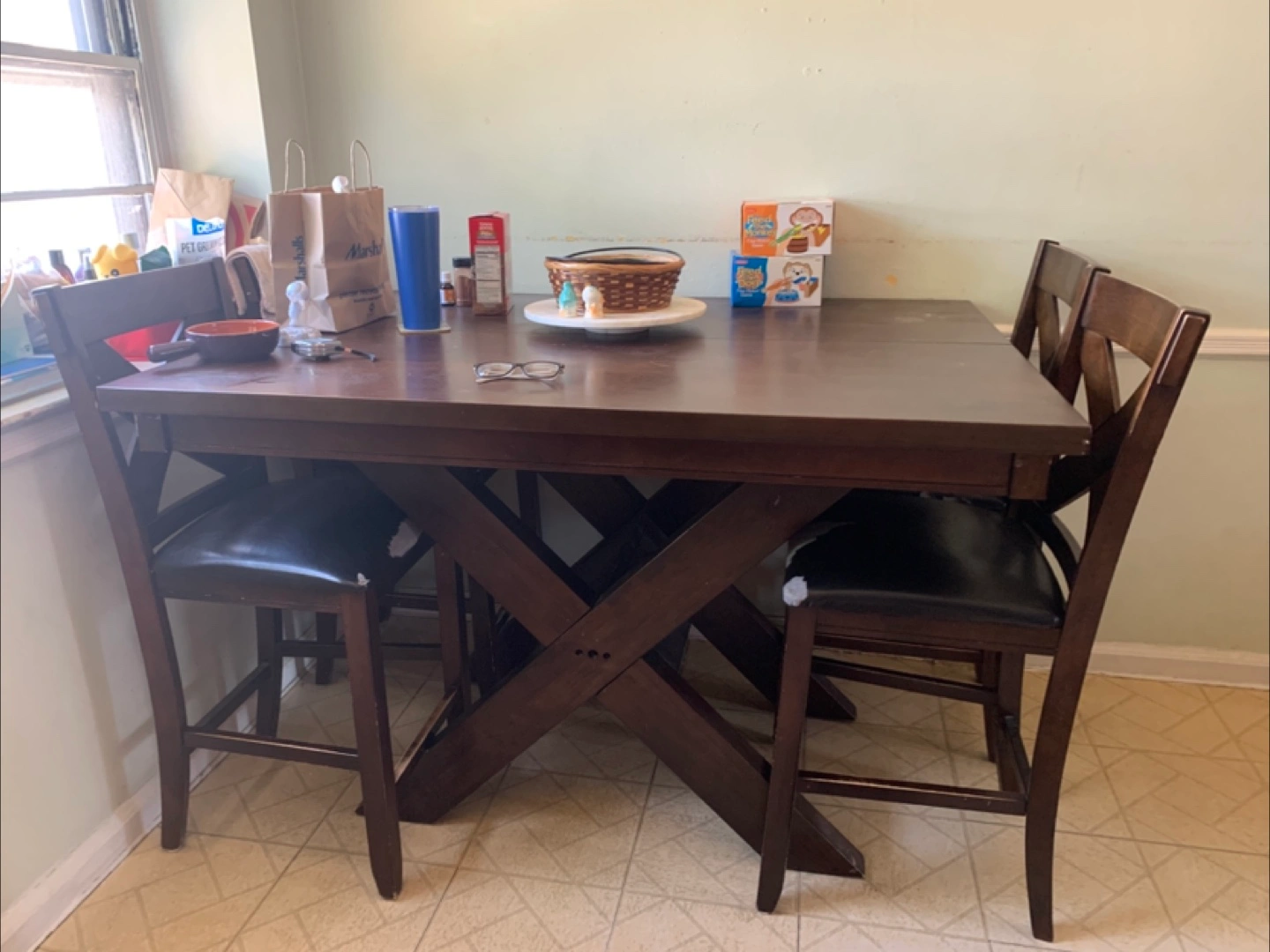 Selling an extended dark brown dining table with six chairs. The table has a unique 'X' design on the sides. The chairs have black leather seats. It's a great set for a smaller dining area or kitchen!