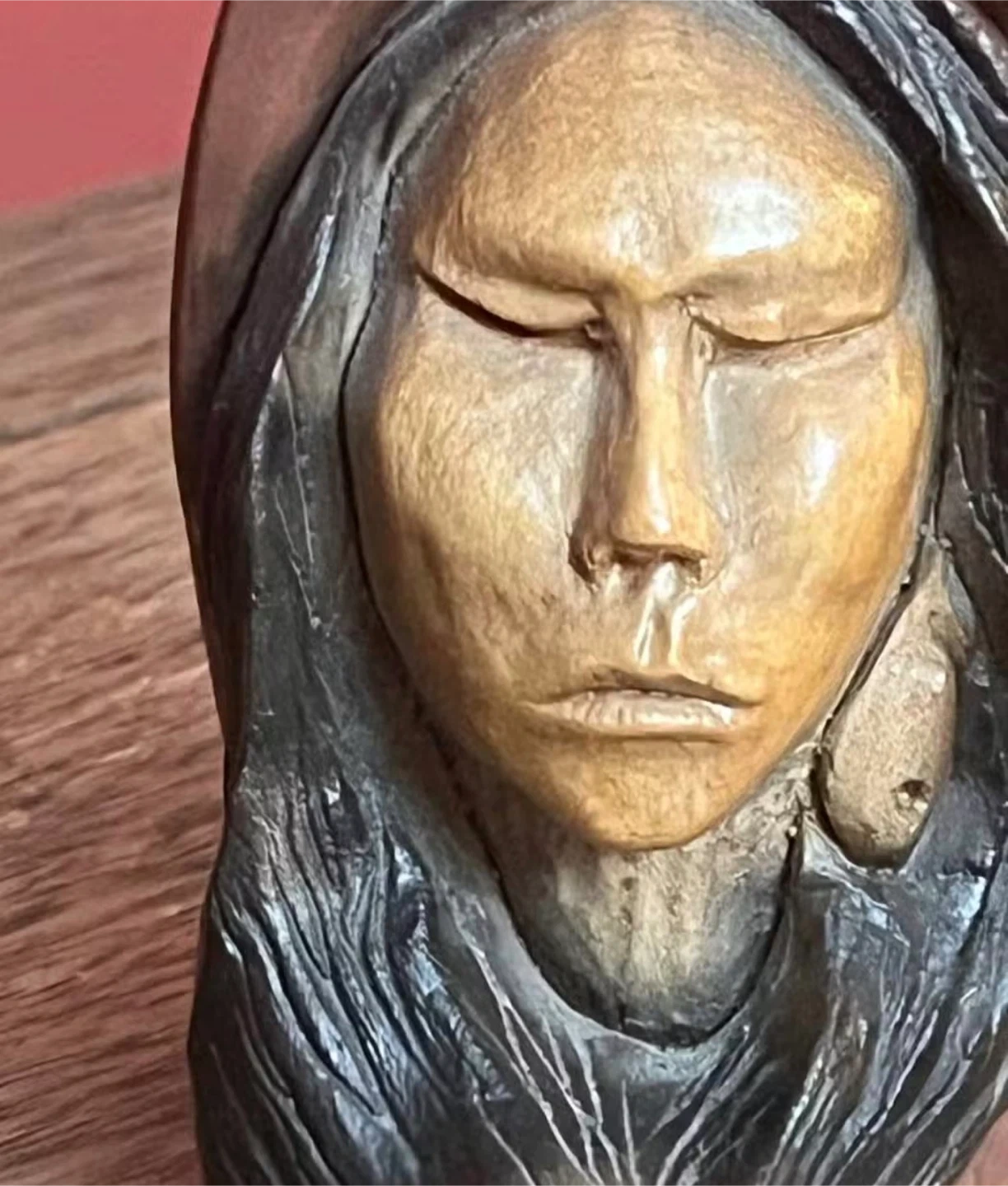 Carved wooden art piece titled "Memories" by Thomas Maracle. This expressive carving depicts a woman with her eyes closed, adorned in a hood. Its unique artistry would be a thoughtful addition to any decor.