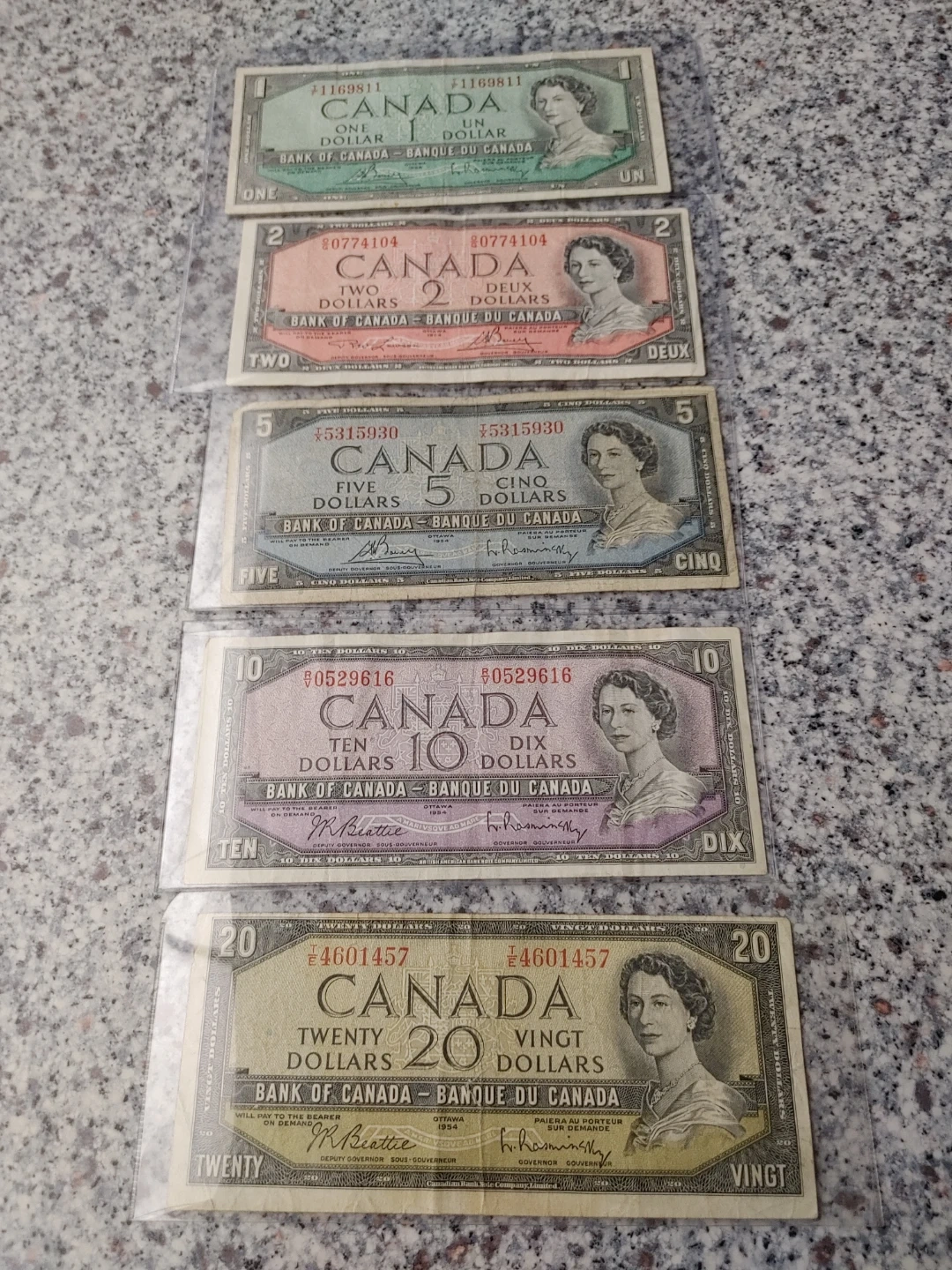 Selling a set of vintage Canadian bank notes. Includes a one dollar, two dollar, five dollar, ten dollar, and twenty dollar bill. Great for collectors!