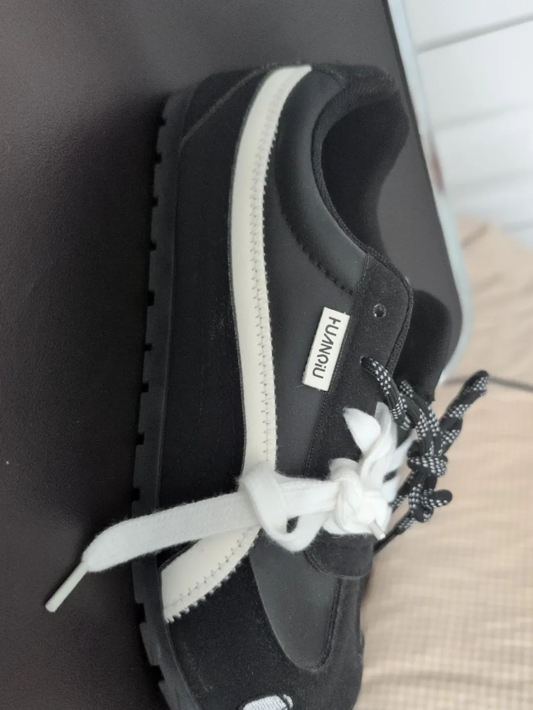 Black FUINQIU sneakers featuring a white stripe detail. These stylish kicks have a black and white patterned lacing. They're made with a combination of suede and faux leather for a mixed-texture look.