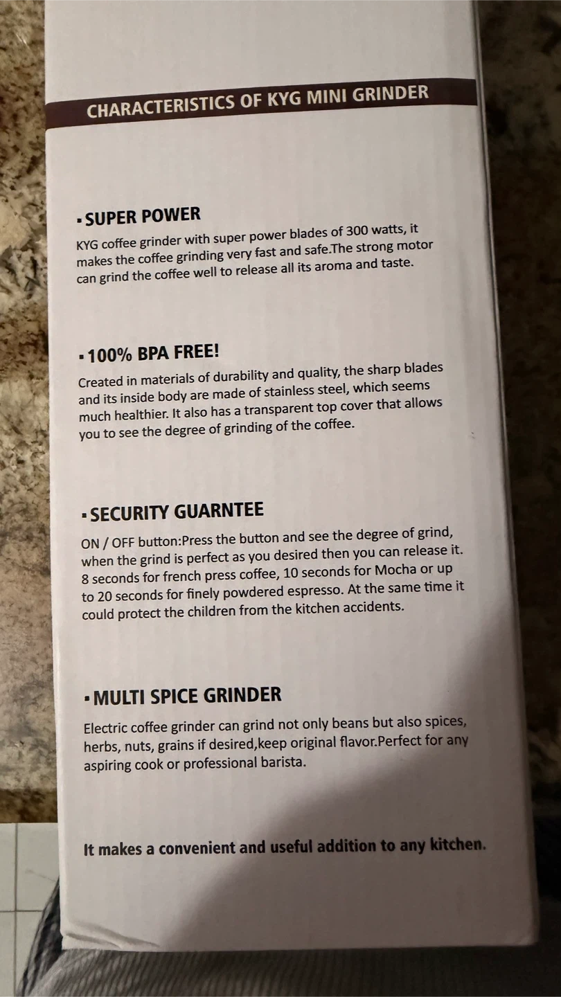 KYG coffee grinder with 300 Watts motor and stainless steel blades. It's ideal for grinding coffee beans, spices, herbs, nuts, and grains. It has a security guarantee with an on/off button for easy operation.
