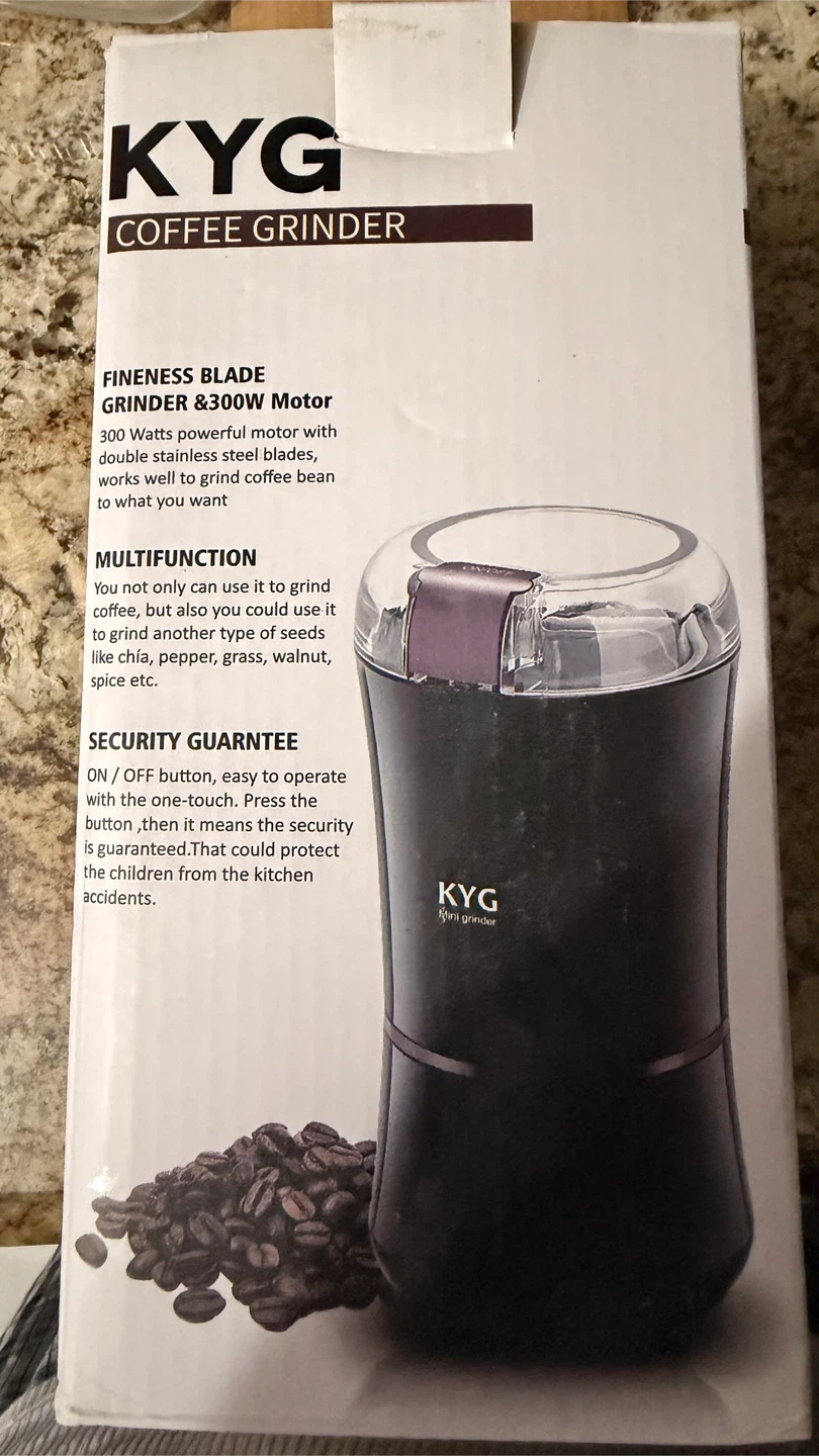 KYG coffee grinder with 300 Watts motor and stainless steel blades. It's ideal for grinding coffee beans, spices, herbs, nuts, and grains. It has a security guarantee with an on/off button for easy operation.