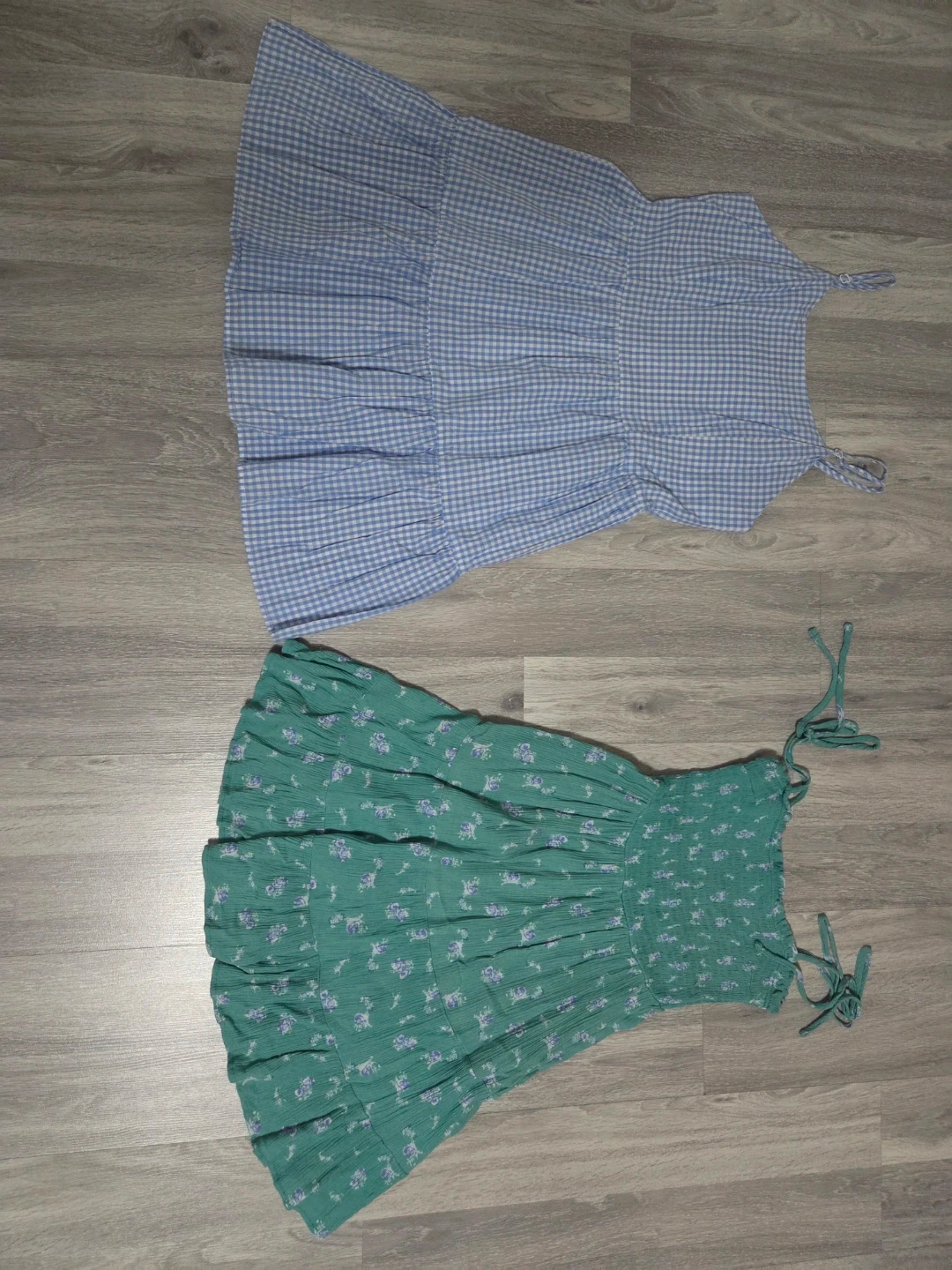Two cute sundresses for warmer weather! One features a classic blue gingham pattern with a tiered skirt. The other is a vibrant green with a ditsy floral print and a smocked bodice. Both have adjustable spaghetti straps and are ready for your next outing! $10 each.