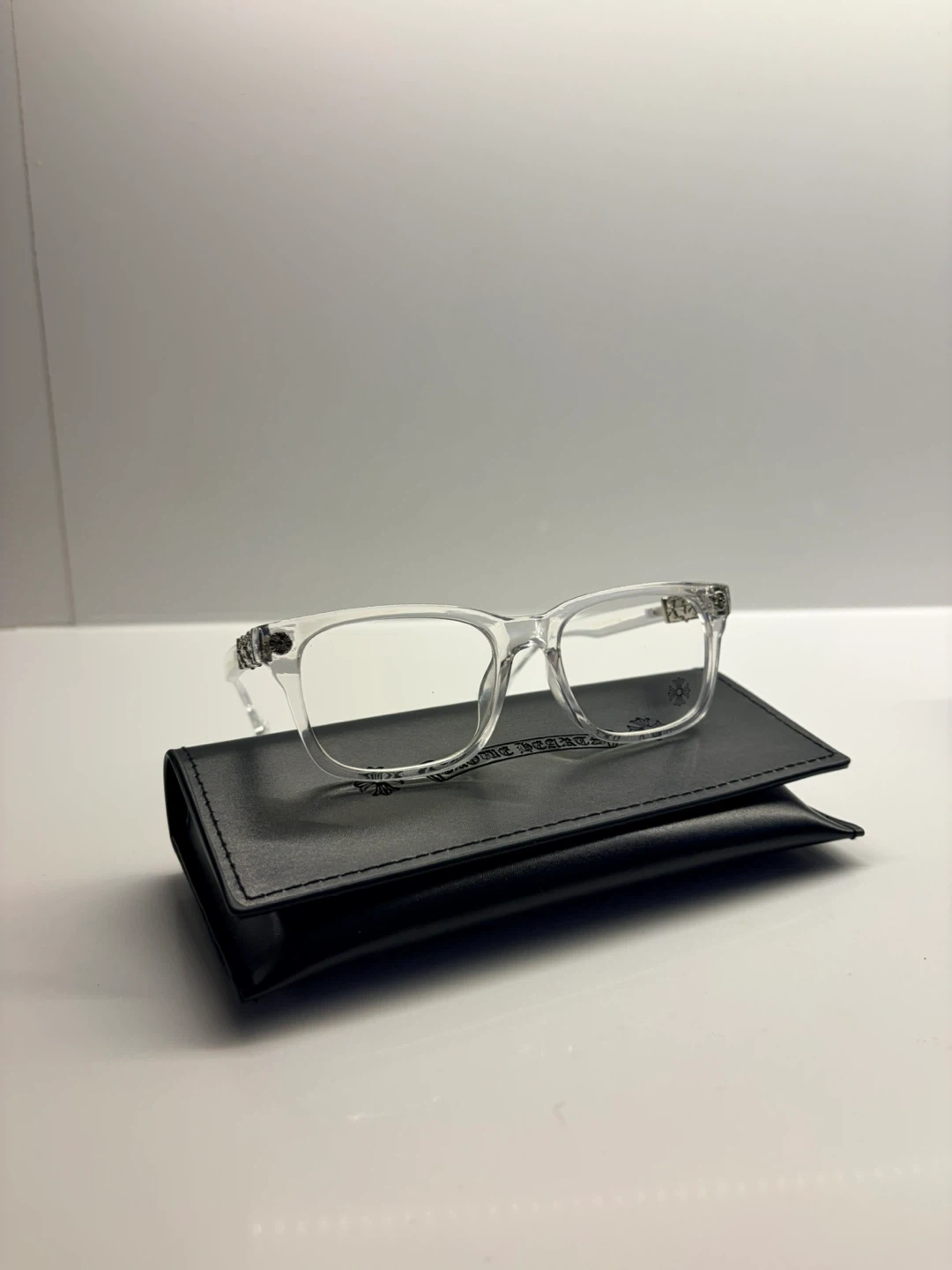 Clear frame glasses with silver accents on the temples. Includes original box and case. These are statement eyewear pieces.