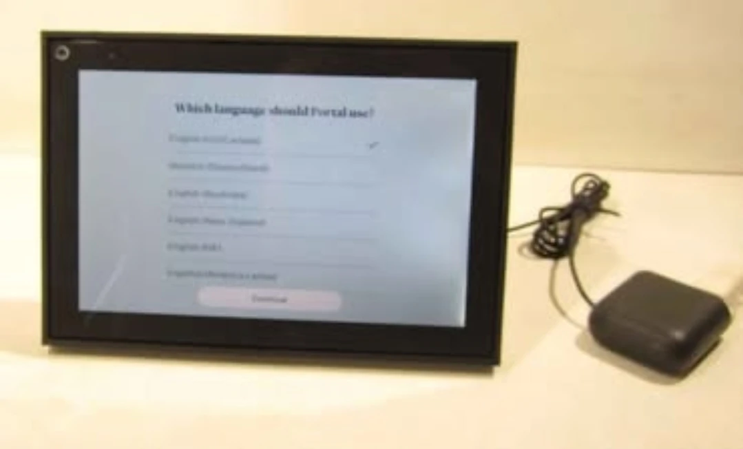 This item is a Facebook Portal Mini smart video calling display, shown during its initial language setup screen.