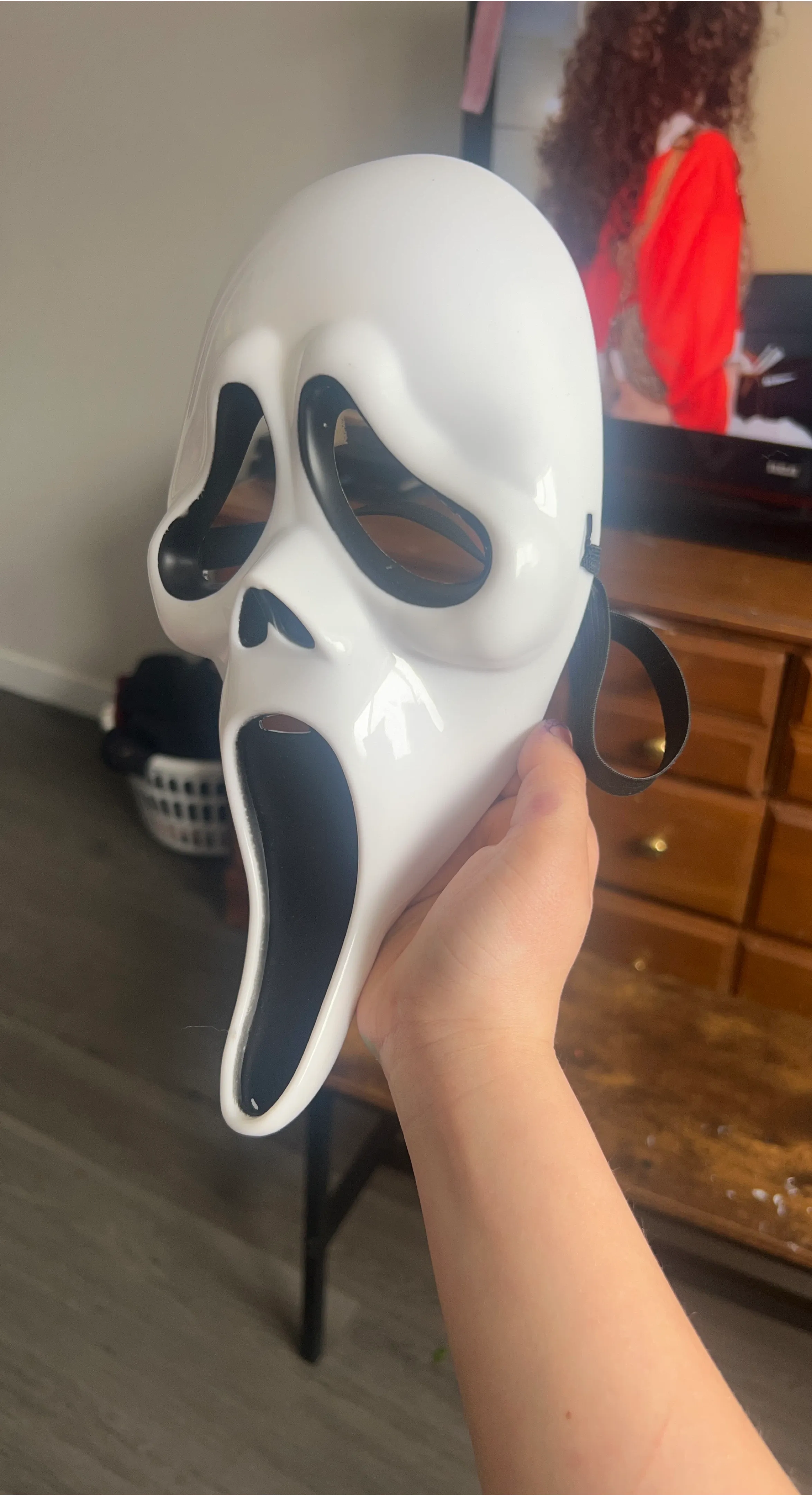 This is a white Ghost Face mask. It's a plastic mask with a black elastic strap. Great for Halloween or costume parties!