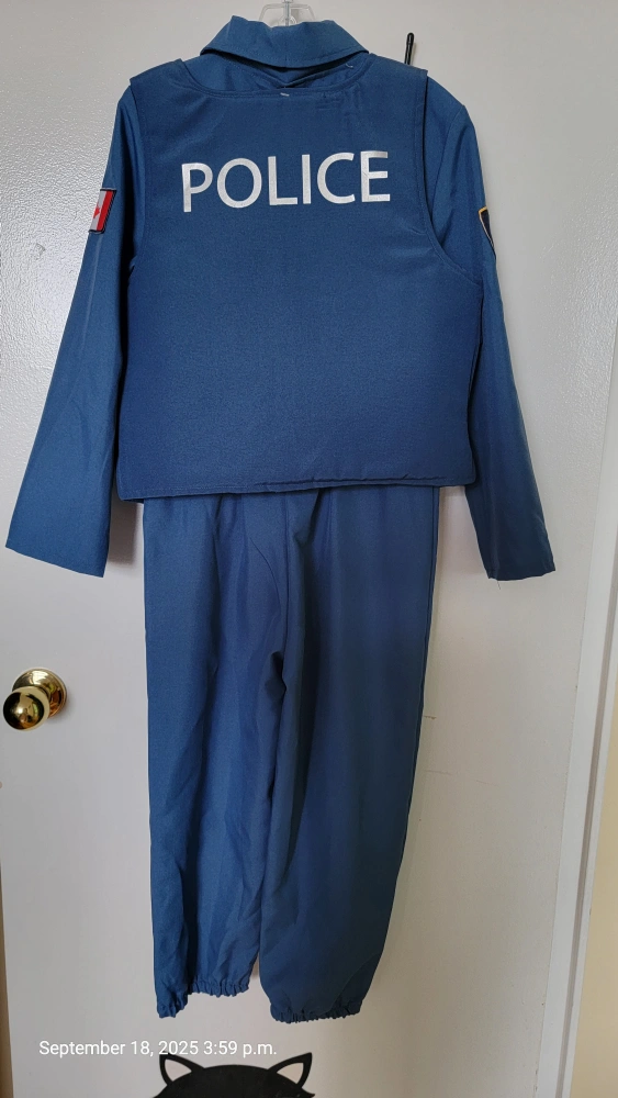 A complete police officer costume for kids! Includes the jacket, pants, belt, handcuffs, flashlight, and walkie-talkie. Perfect for dress-up and imaginative play!