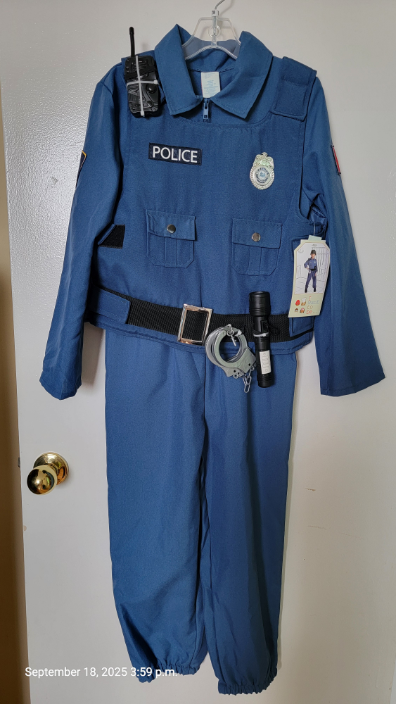 A complete police officer costume for kids! Includes the jacket, pants, belt, handcuffs, flashlight, and walkie-talkie. Perfect for dress-up and imaginative play!