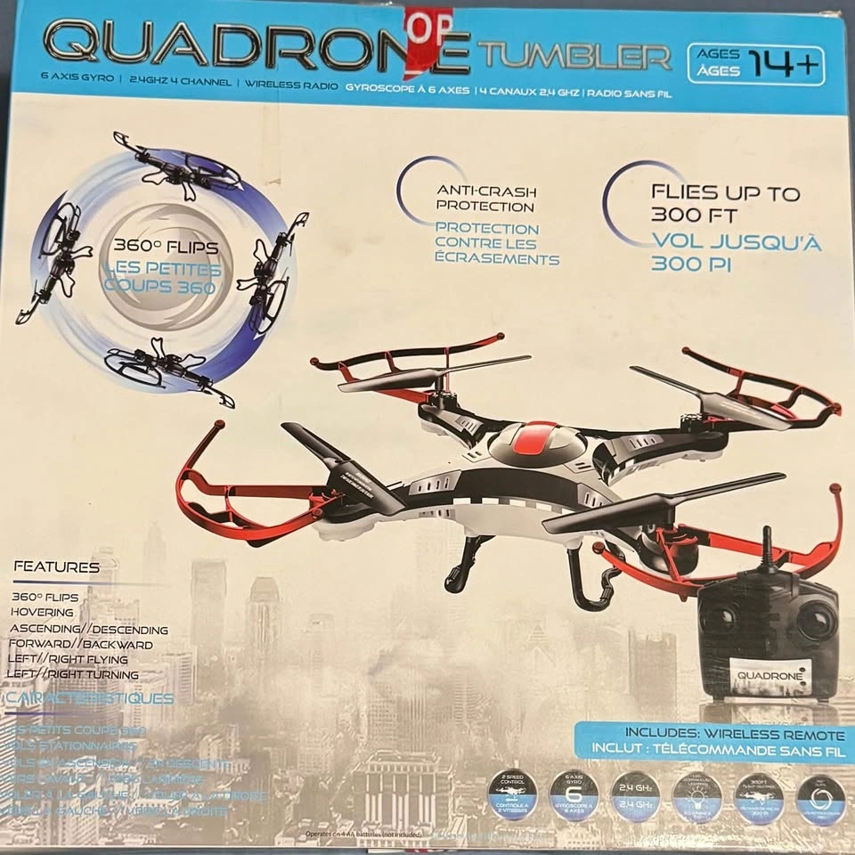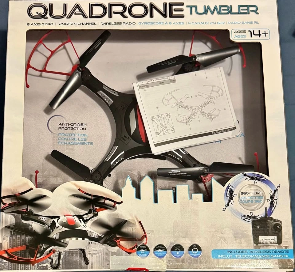 Quadrone Tumbler drone with 6-axis gyro, 2-speed control, 2.4GHz 4-channel wireless radio, LED lighting, 300ft flight distance, 360° flips, and anti-crash protection.