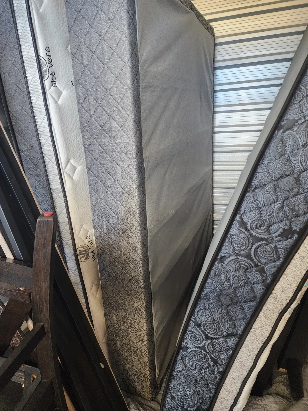 White Aloe Vera double size mattress with a grey patterned side. It's a comfortable mattress for a good night's sleep. This mattress is suitable for any bedroom. It comes with boxspring.