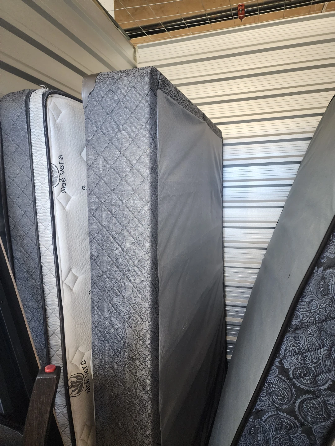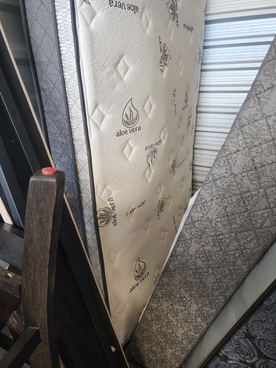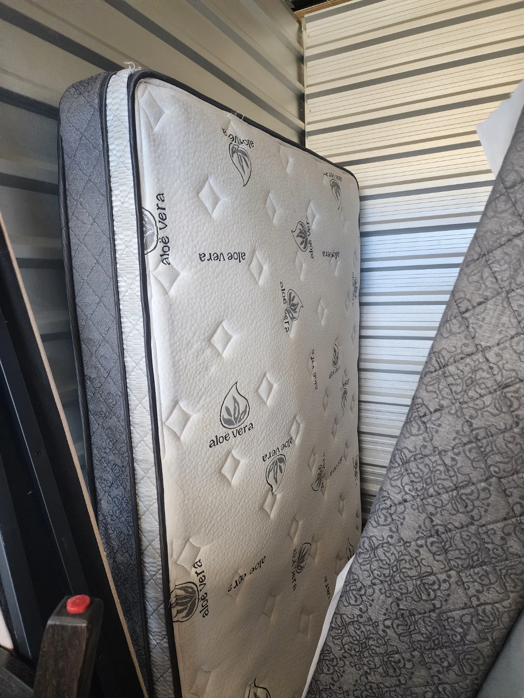 White Aloe Vera double size mattress with a grey patterned side. It's a comfortable mattress for a good night's sleep. This mattress is suitable for any bedroom. It comes with boxspring.