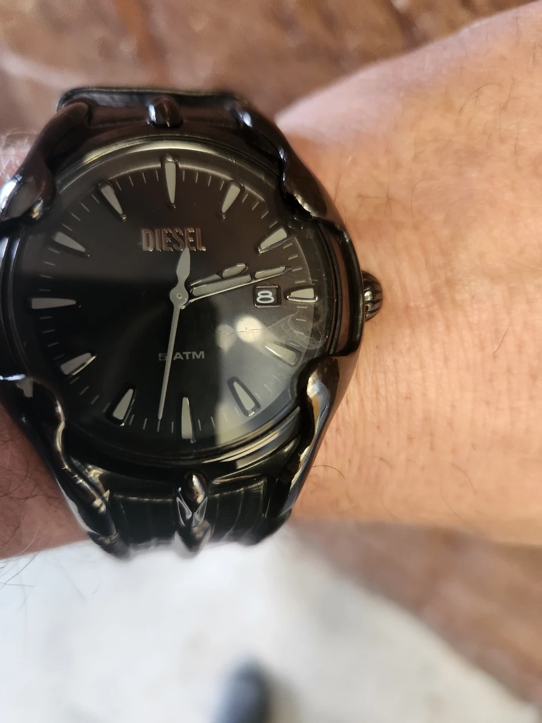 Diesel watch with a black face and a date display. It's water resistant up to 5 ATM. This watch is a stylish accessory for everyday wear. I purchased this watch for 375.00 last year I've worn it 5 times