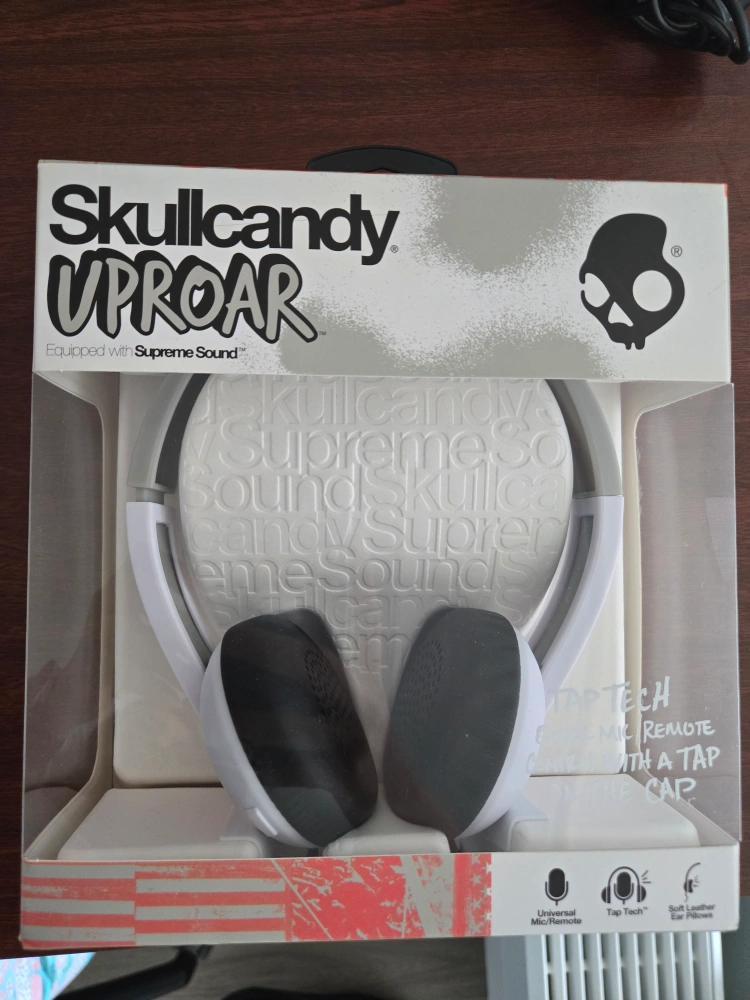 White Skullcandy wired Uproar headphones in box.Features a universal mic remote. Soft leather earcups. Tap Tech functionality.