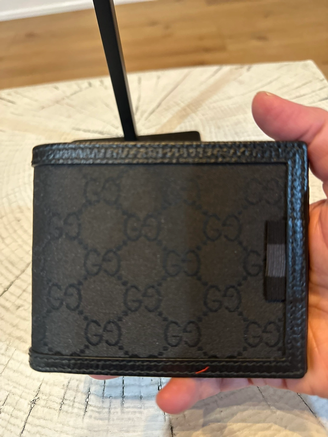 Black leather bifold wallet. Features the iconic Gucci GG Supreme canvas. Multiple card slots and bill compartments. Brand new