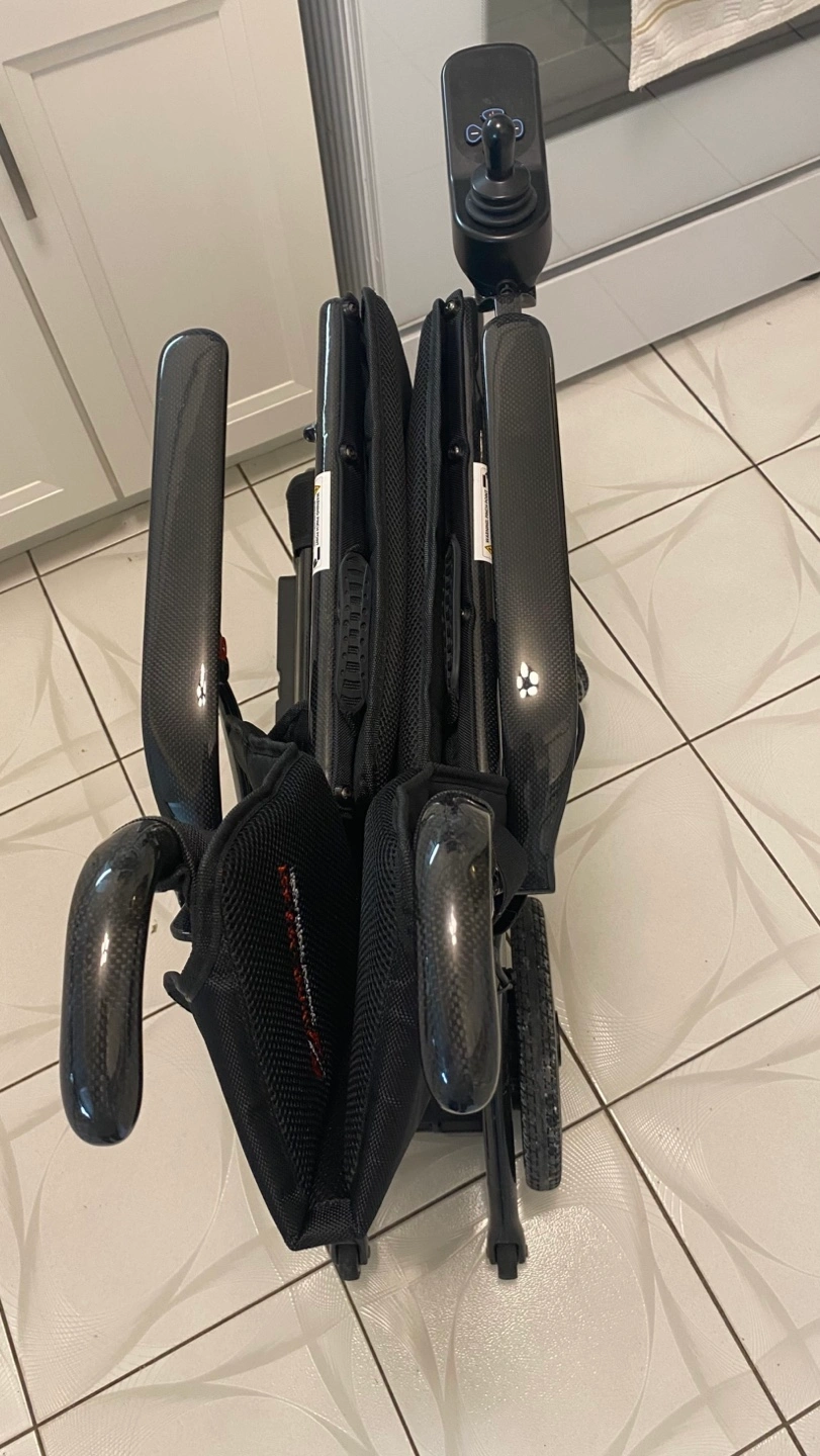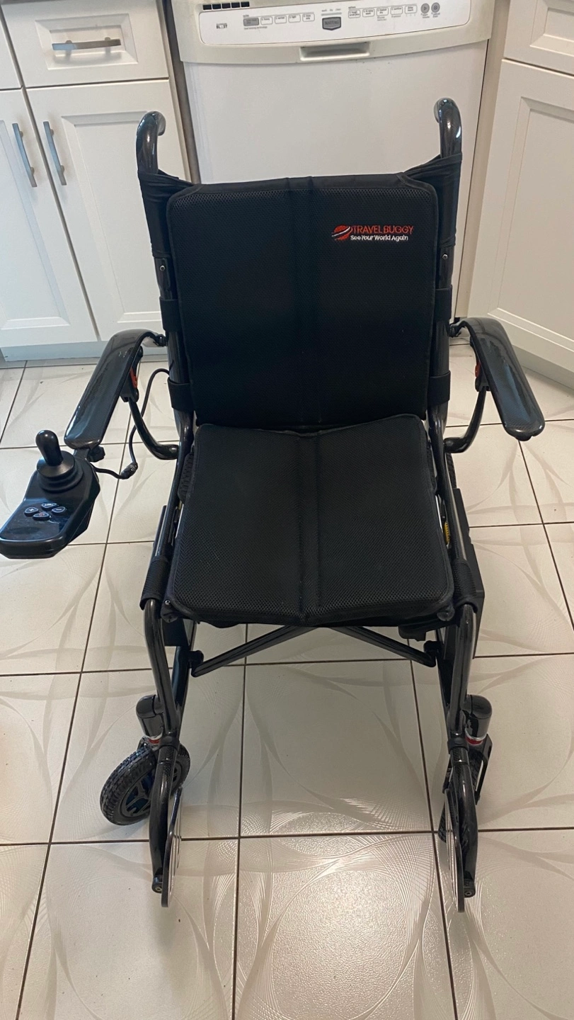 Light weight portable electric wheelchair. Approx 40 lbs. Designed specifically for travel. Can be transported easily in trunk of car or checked on any airline. Black frame. Foldable design. 360 Joystick control, tight turning radius. Excellent condition. Purchased July 11/24