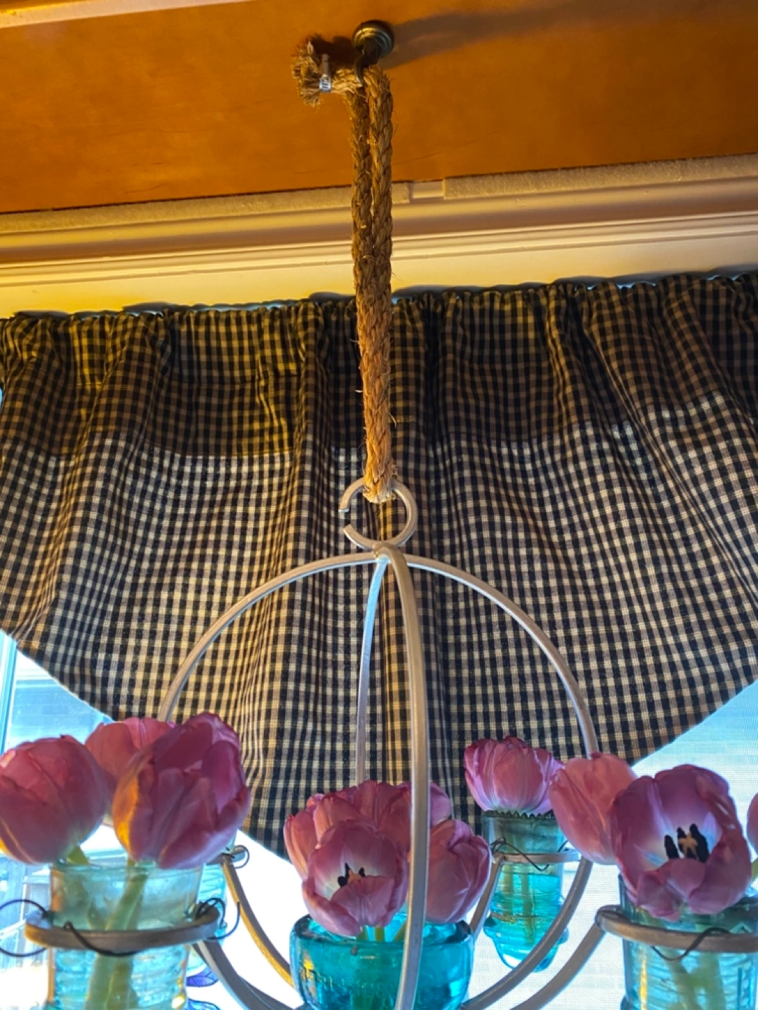 Unique hanging planter. Metal frame with rope hanger. Holds multiple glass jars. Perfect for flowers or small plants. Farmhouse style.