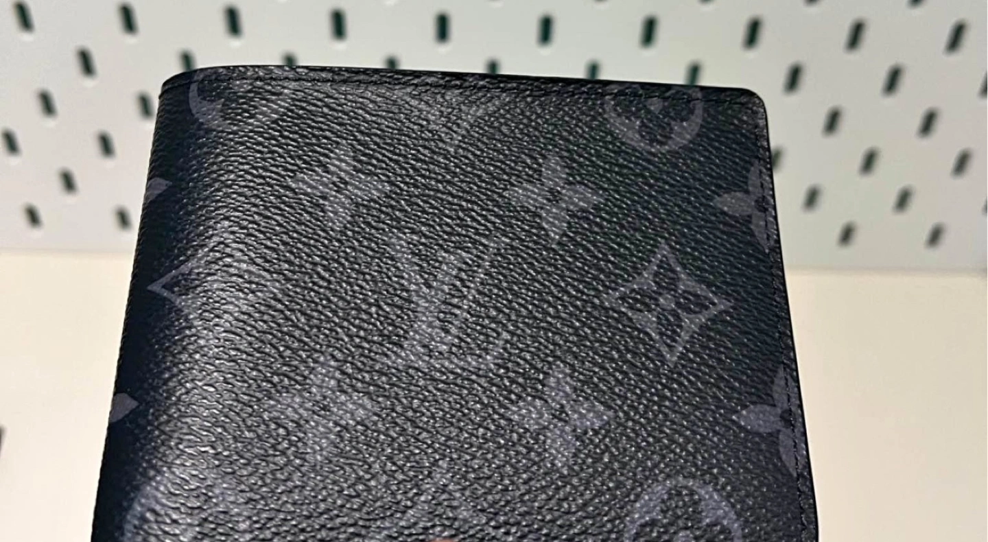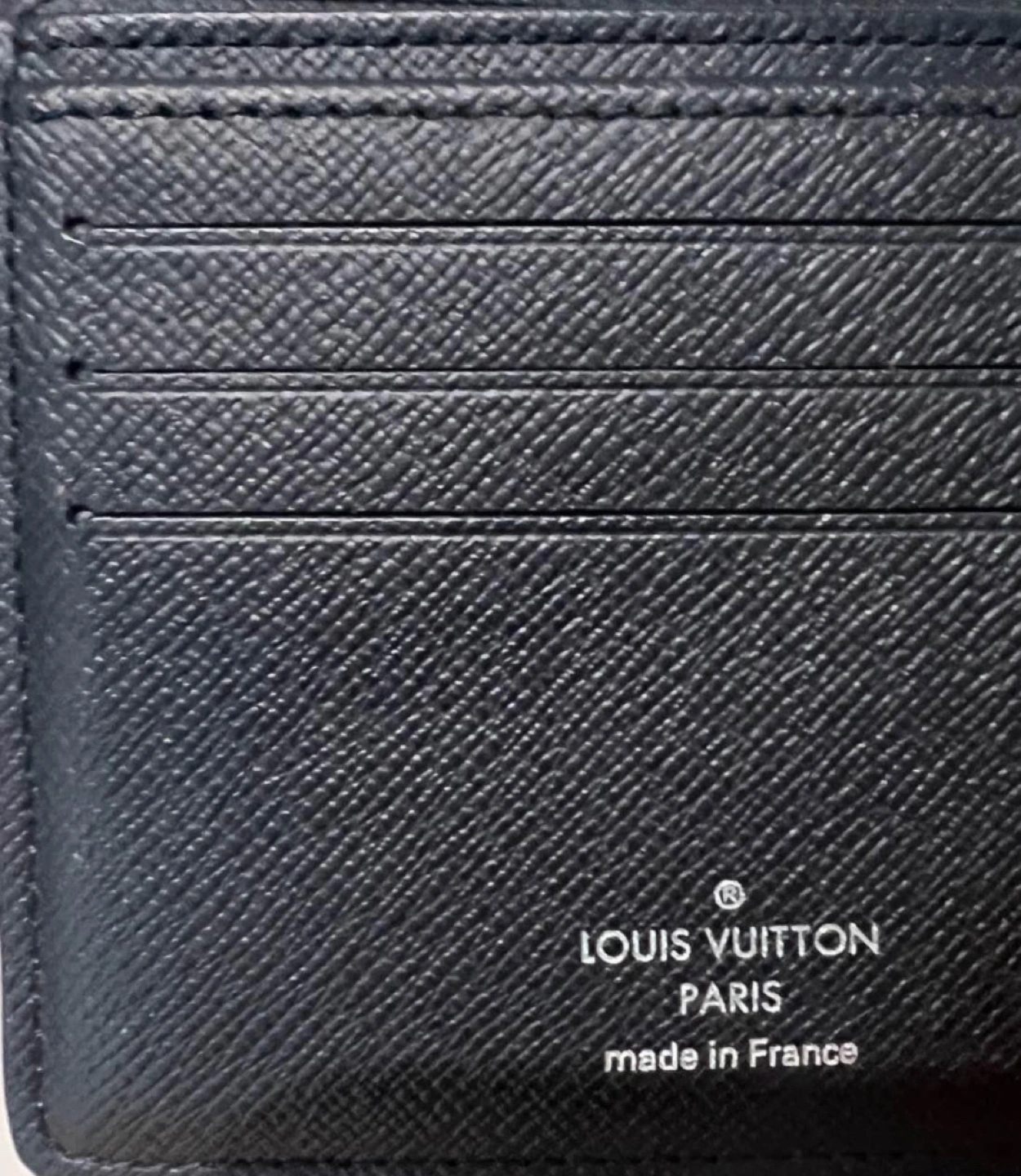 Genuine LOUIS VUITTON men's bifold wallet. Black leather exterior. Multiple card slots and compartments. Made in France. Comes with original box.