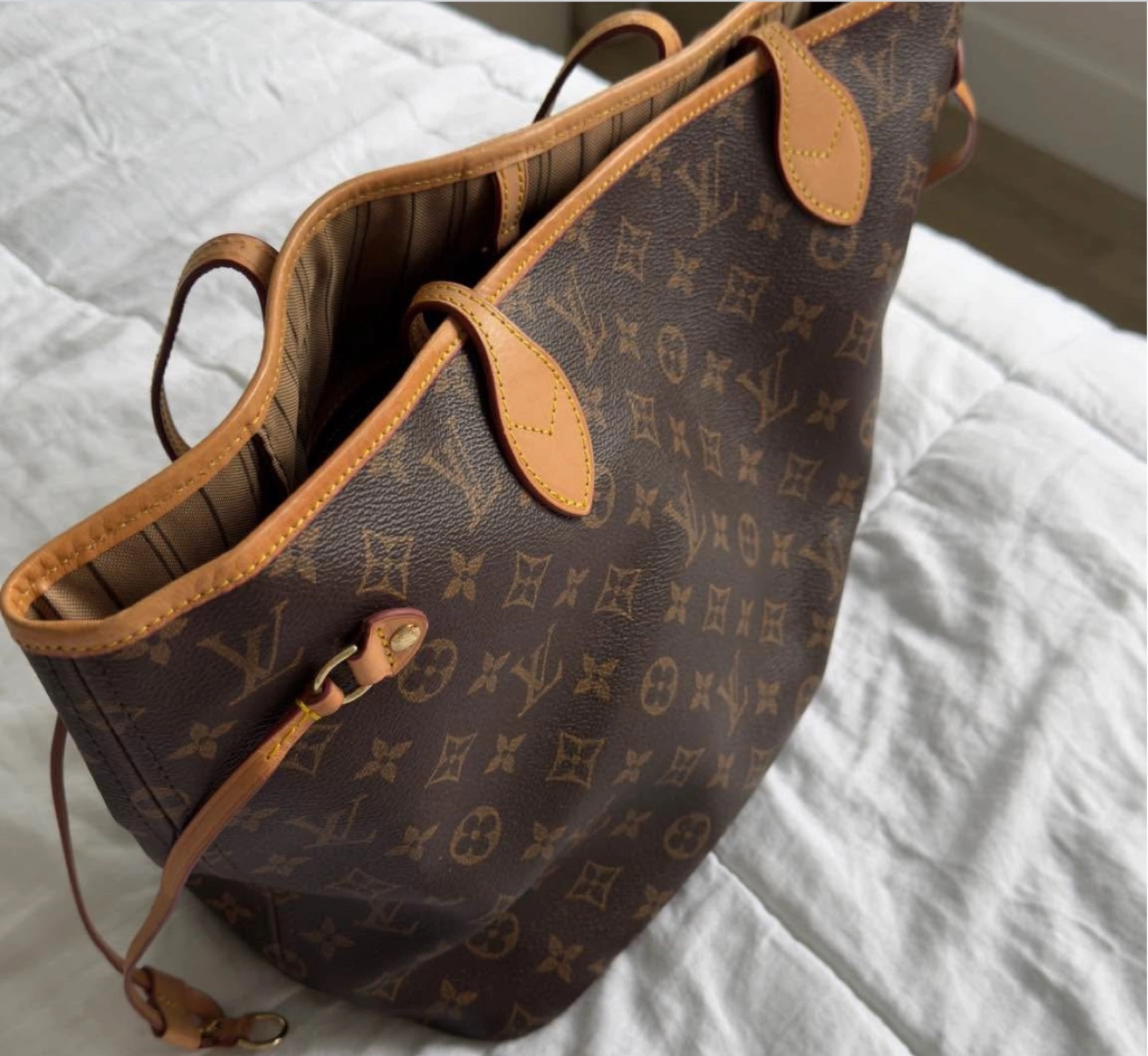 Pre-owned Louis Vuitton Neverfull MM. Monogram canvas. Tan leather trim. Double handles. Interior pockets. Spacious design. Classic style.