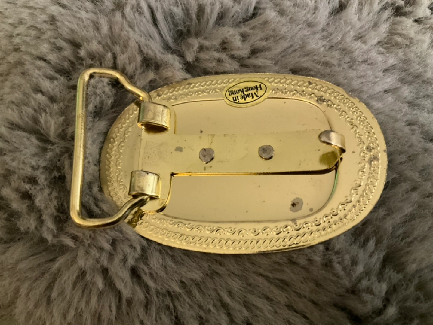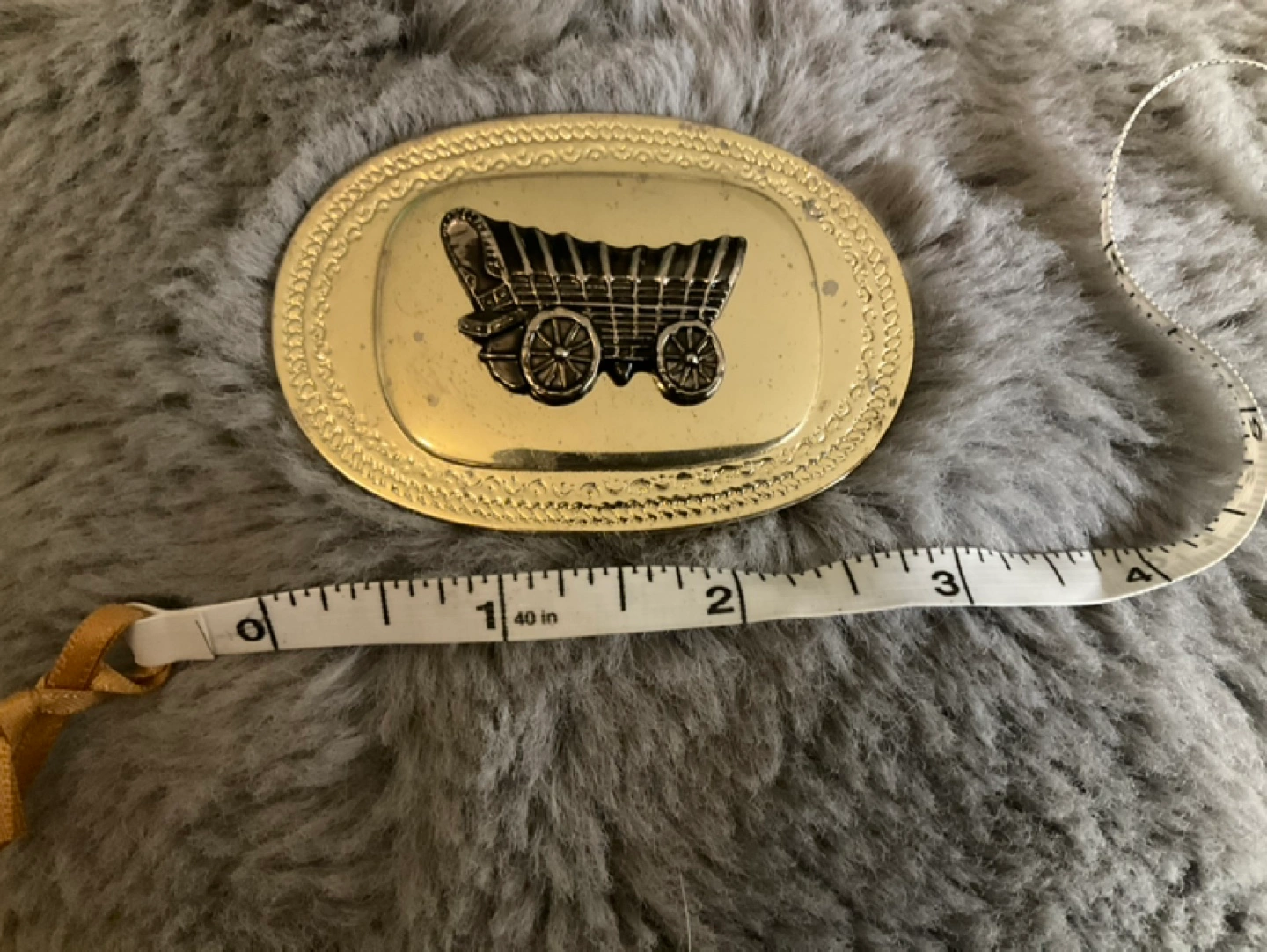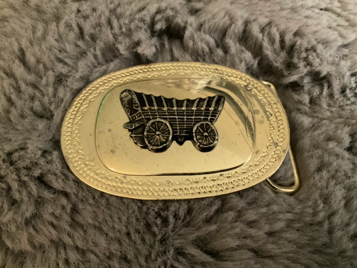 Oval-shaped belt buckle. Features a covered wagon design. Made in Hong Kong. Gold-tone metal. Pre-owned.