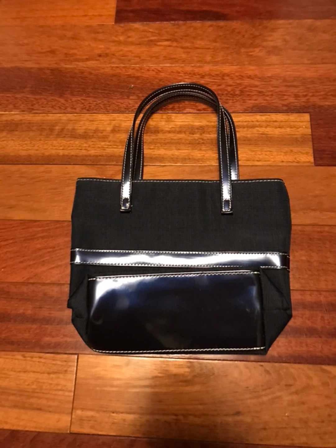 Small black tote bag. Features patent leather bottom section. Top handles. Pick up only at Rockwood Mall