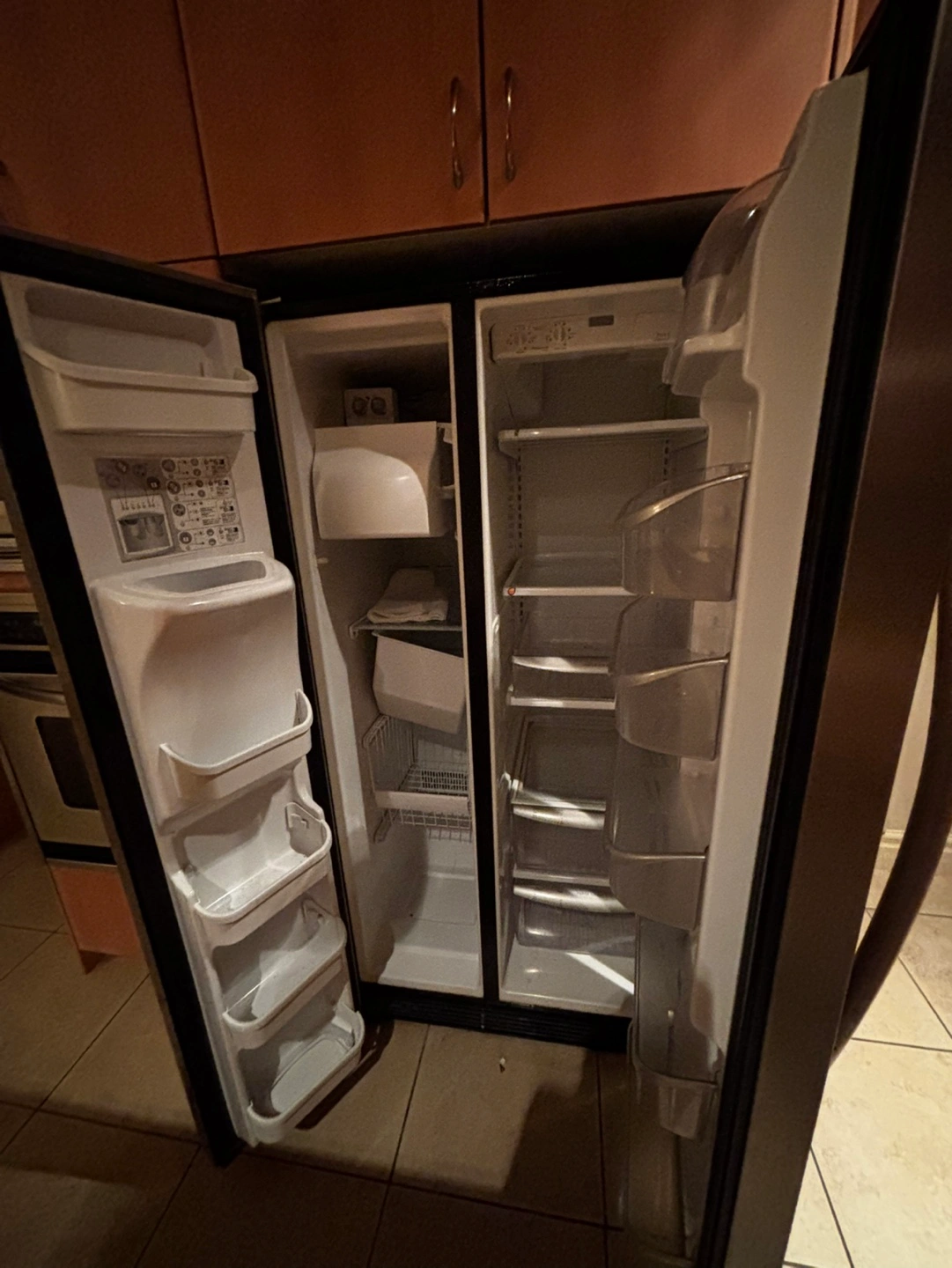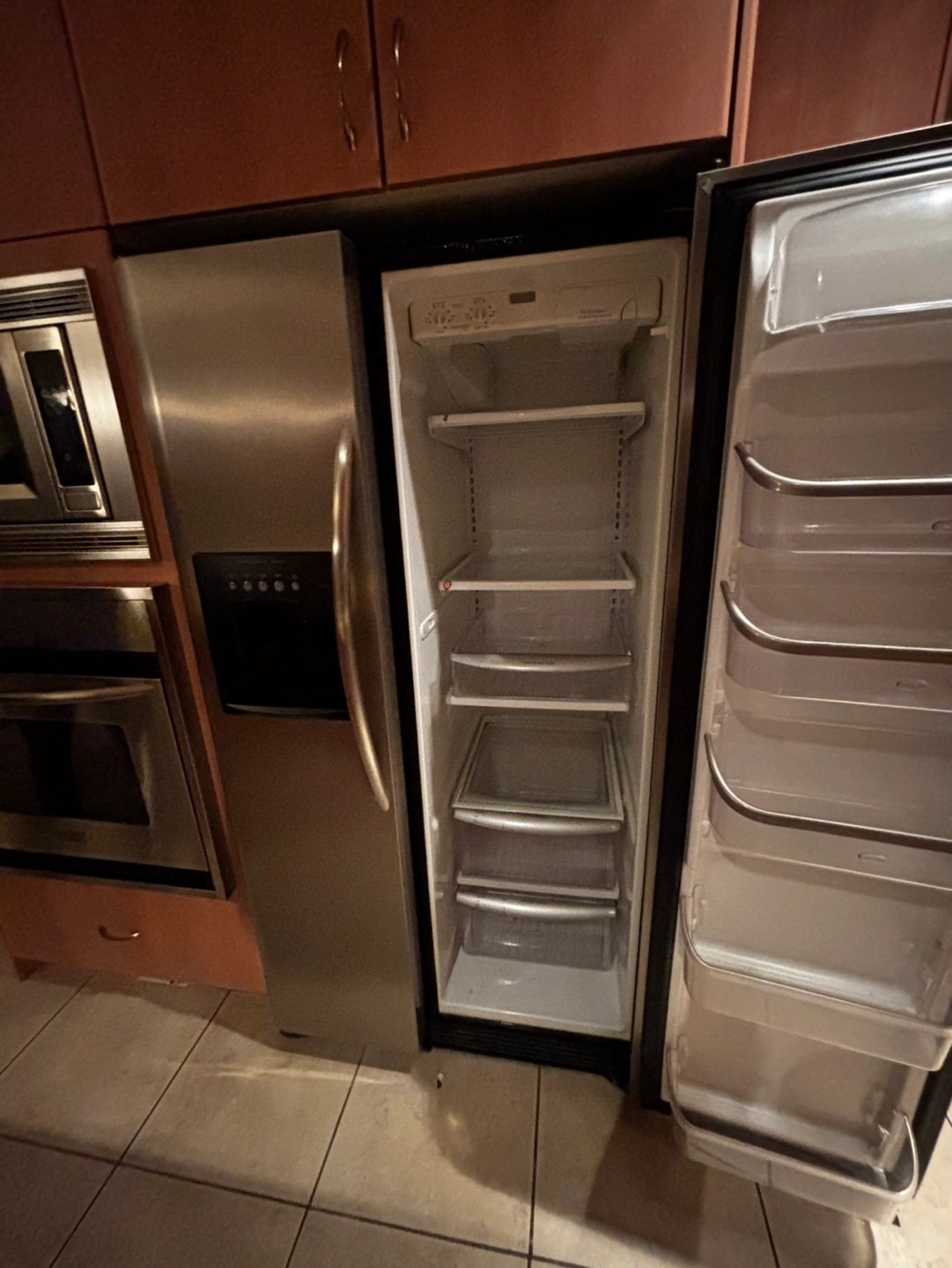 33Stainless steel refrigerator. Lots of shelving. Ice and water dispenser. Good condition.