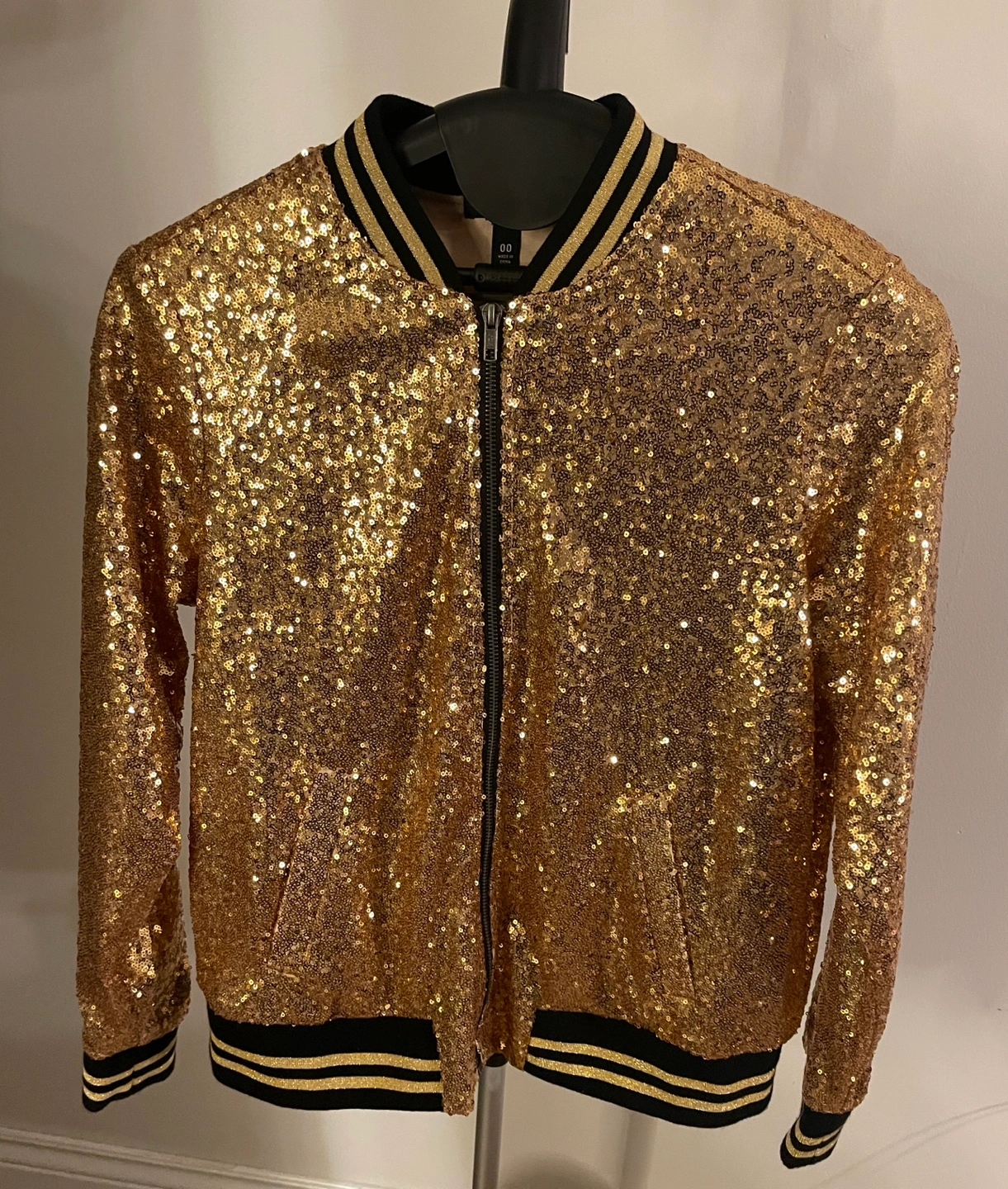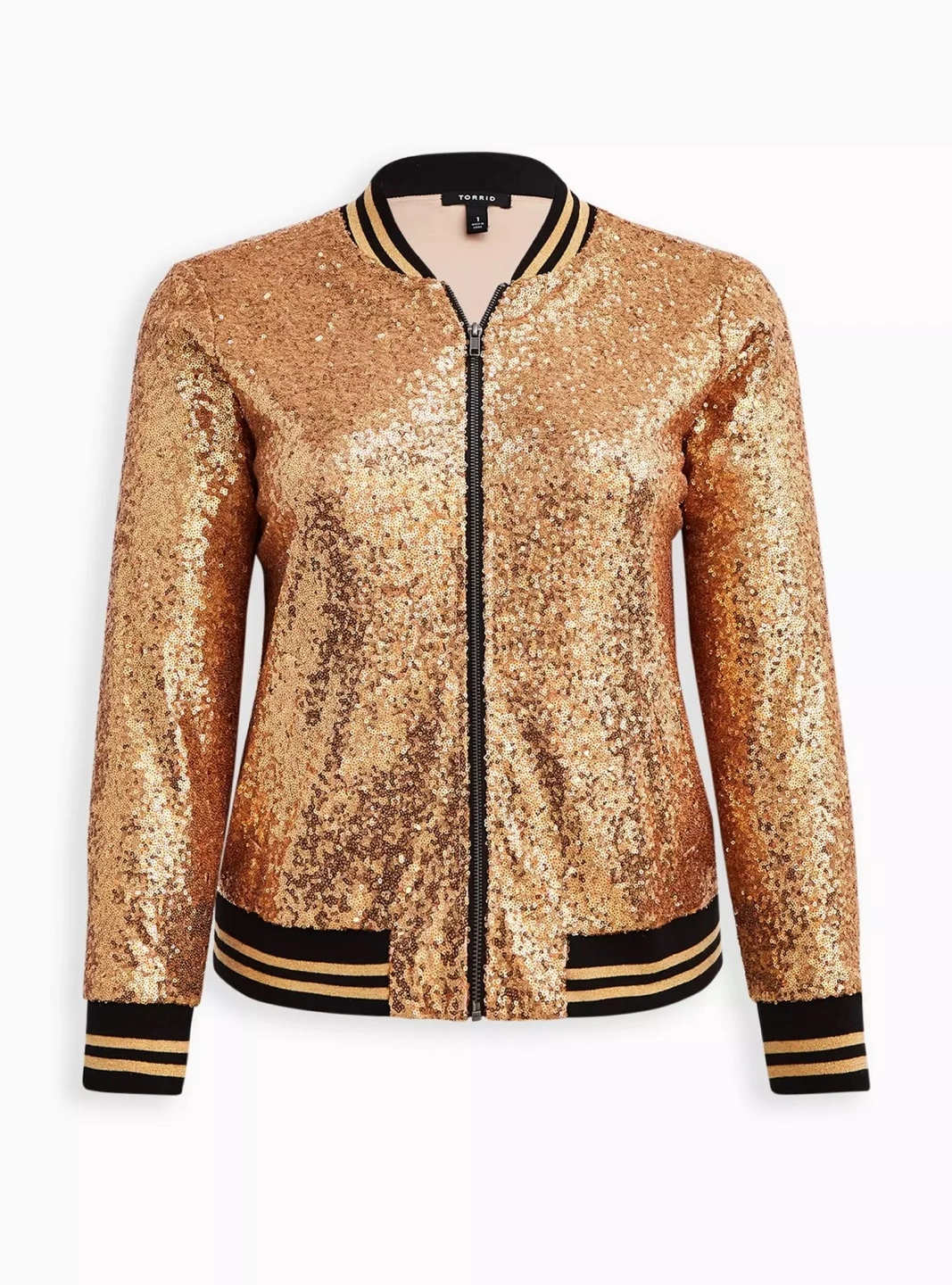 Never worn, only tried on. Size 00, US 10-12, M/L. Loose fit. Elevate your style with this Torrid bomber jacket, featuring a dazzling gold sequin design. The ribbed black and white collar, cuffs, and waistband add a sporty touch to its luxurious look. Perfect for making a statement while maintaining a classic bomber silhouette.