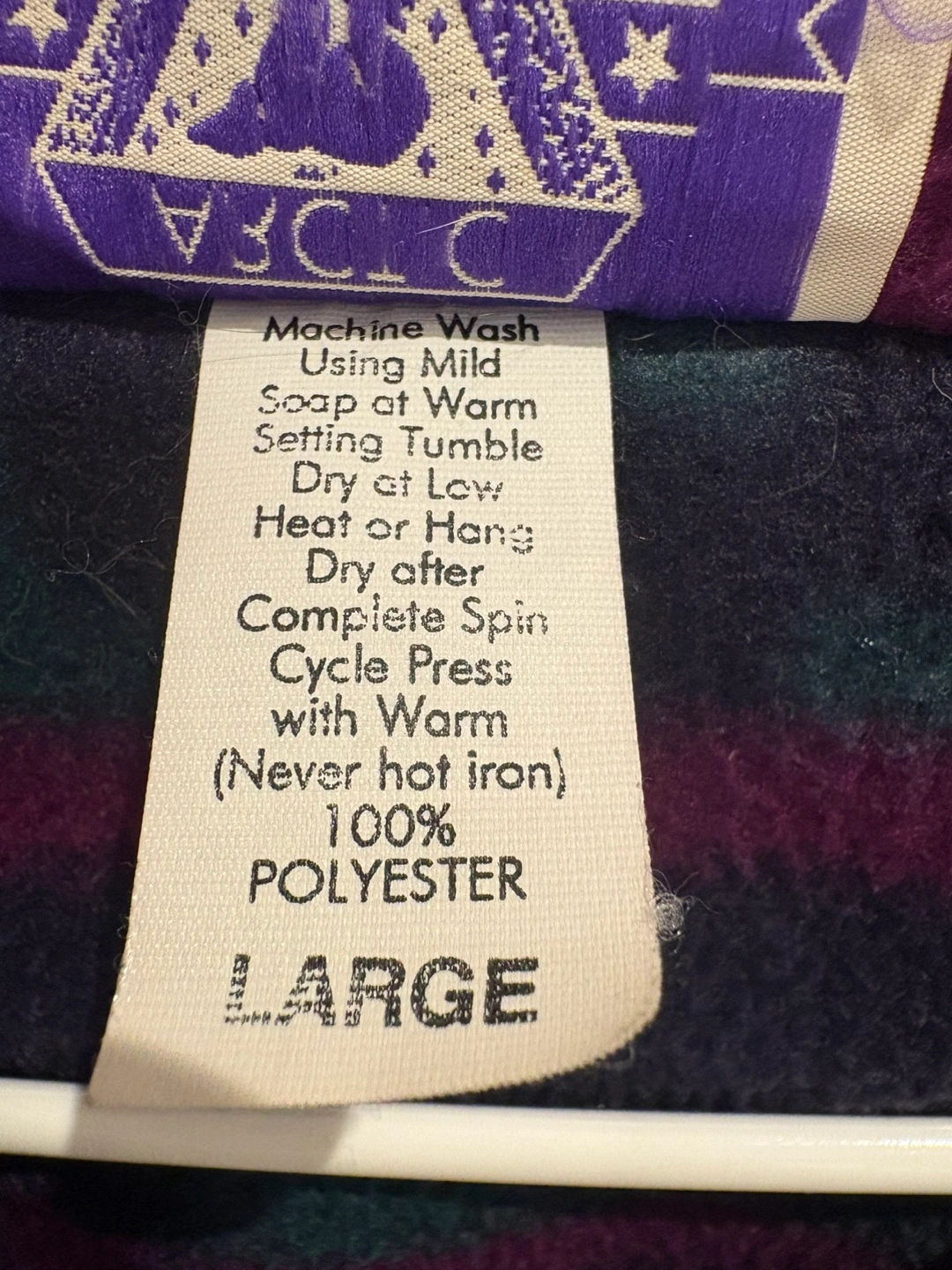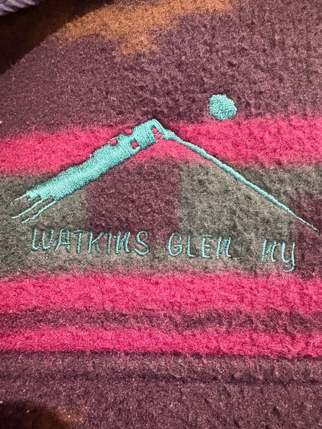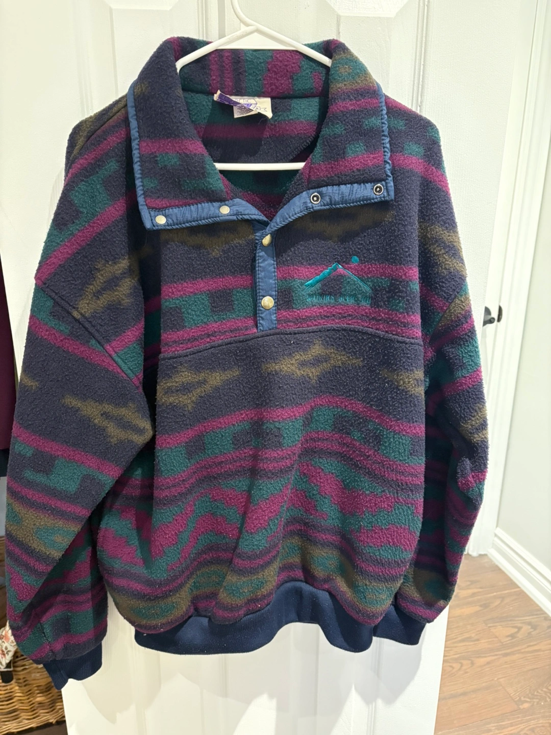 Vintage Arctic Image pullover fleece. Size large. Features a colourful southwestern-style pattern and embroidered Watkins Glen, NY logo. 100% polyester. Snap button placket.