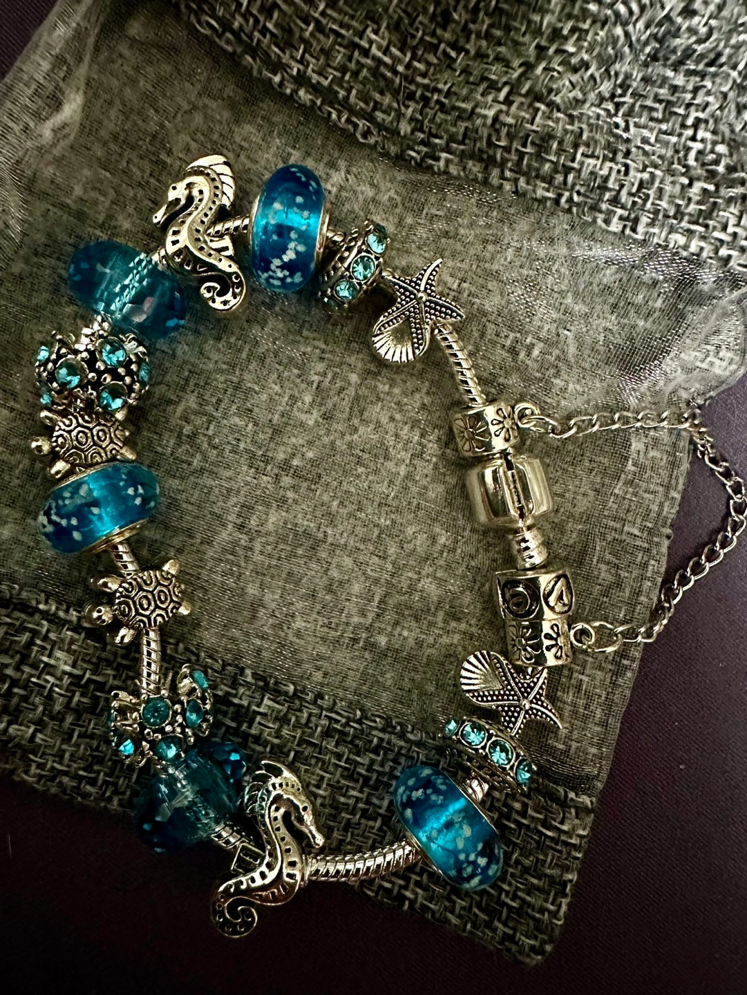 Beautiful pandora-style charm bracelet. Features various ocean-themed charms, including seahorses, starfish, and turtles. Blue and silver tones. Comes in a grey drawstring bag.