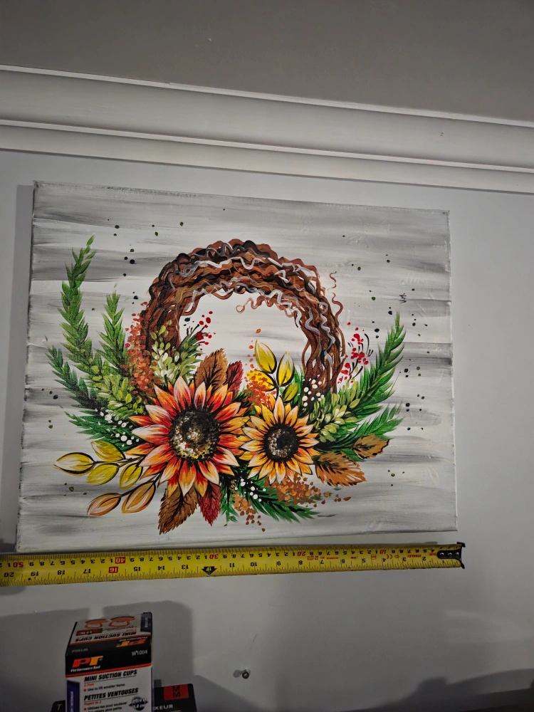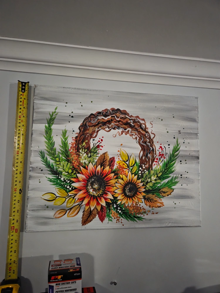 Hand-painted canvas artwork. Features a sunflower wreath design. Autumn colours. Great for home décor.