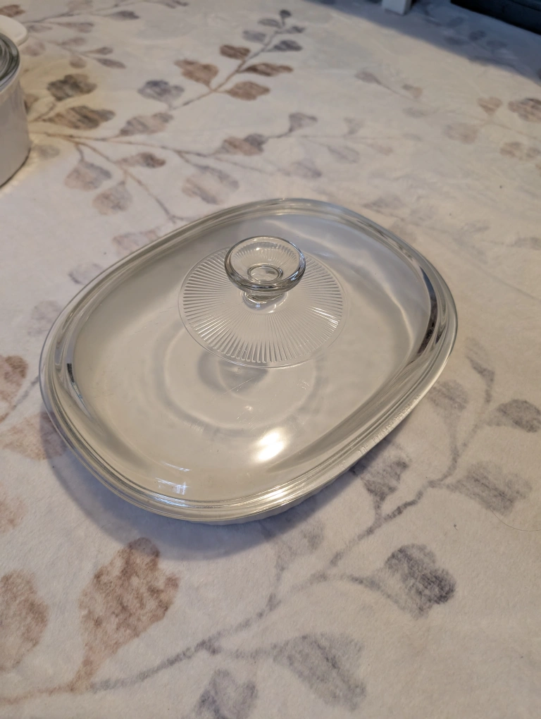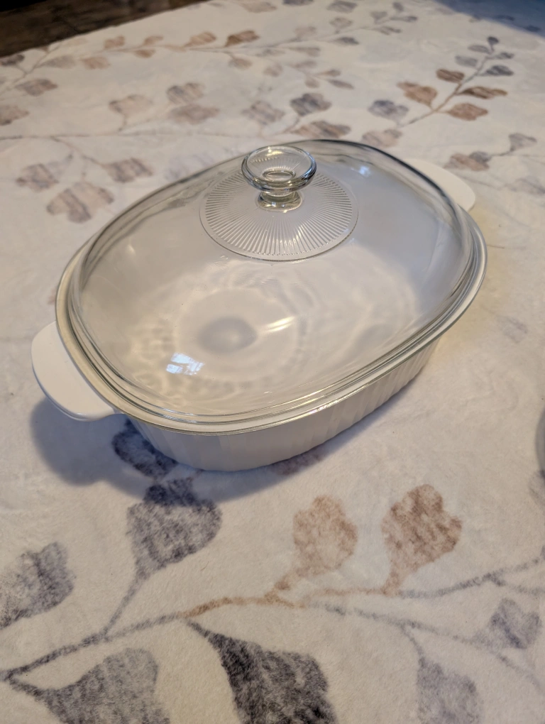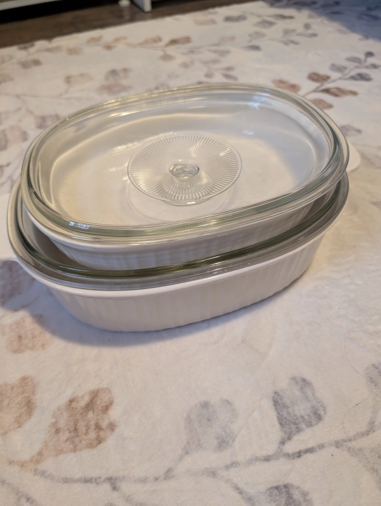 Corningware French white oval baking dishes and glass lids. Microwave and oven safe. Small size: 1-1/2 qt - 1.4 L. Larger one is at least 3-4x capacity of smaller one. No stovetop or broiler use.