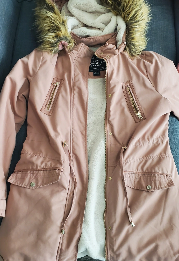 Dusty rose-coloured winter jacket. Features a faux fur-trimmed hood and fleece lining. Gold-toned hardware accents. Size large. Part of the Wanderlust series. Very farm and fuzzy, perfect for winter. Hood is removable and are machine washable. Comes with many pockets and adjustable straps for sizing in multiple areas.