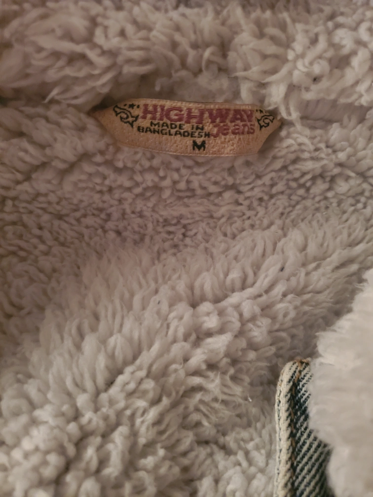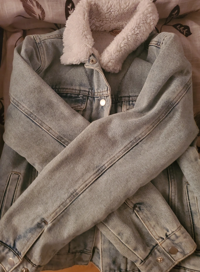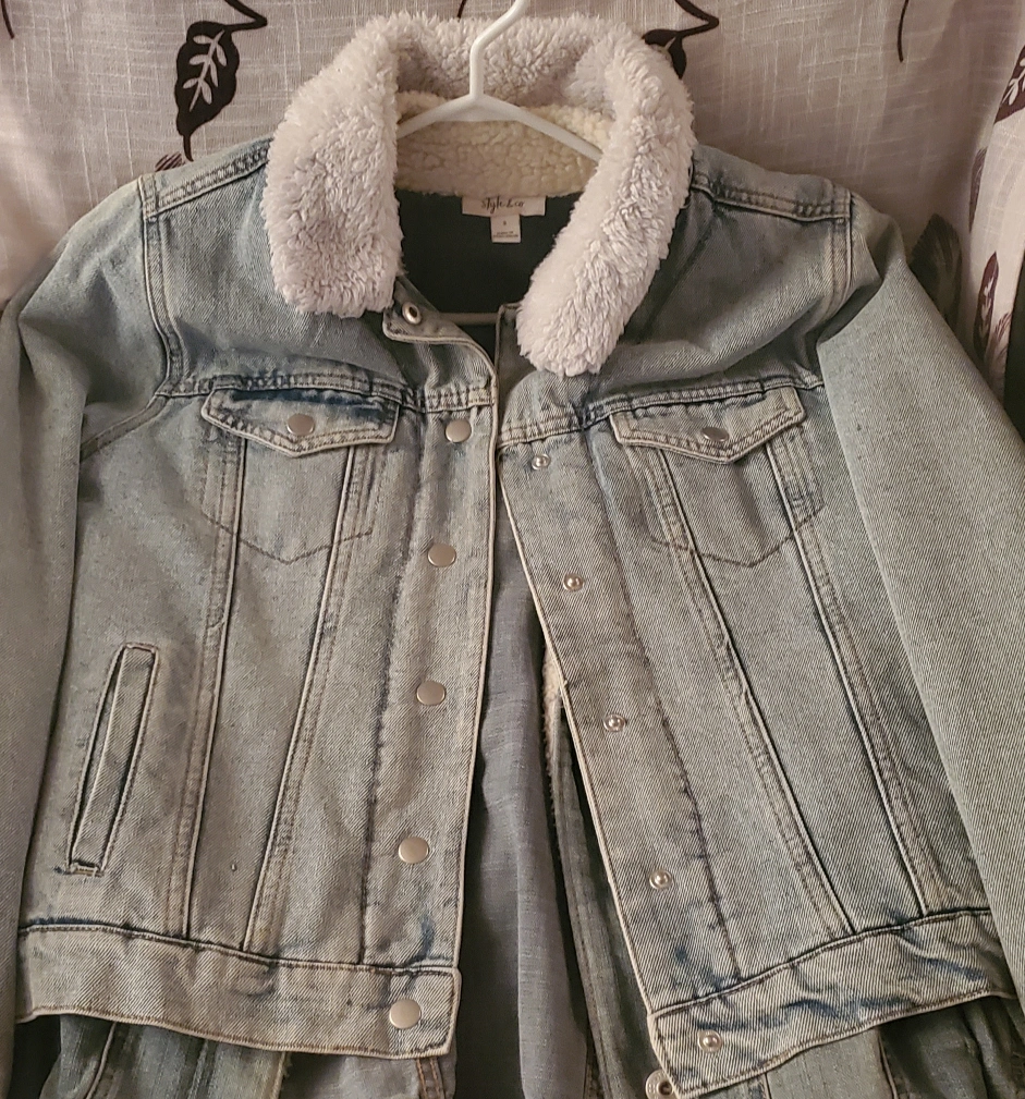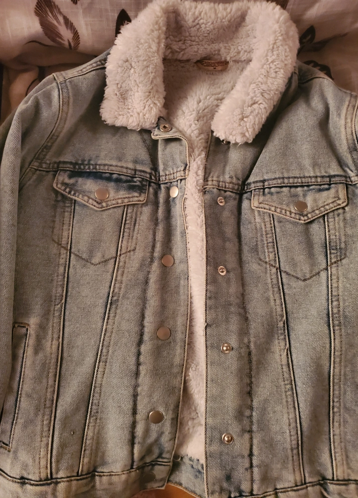 Medium size. Light wash denim jacket. Features a cozy sherpa collar and fully fleeced inside. Size medium. Button closure. Two front pockets. Perfect for fall and spring (transition seasons) for style, comfort and warmth.