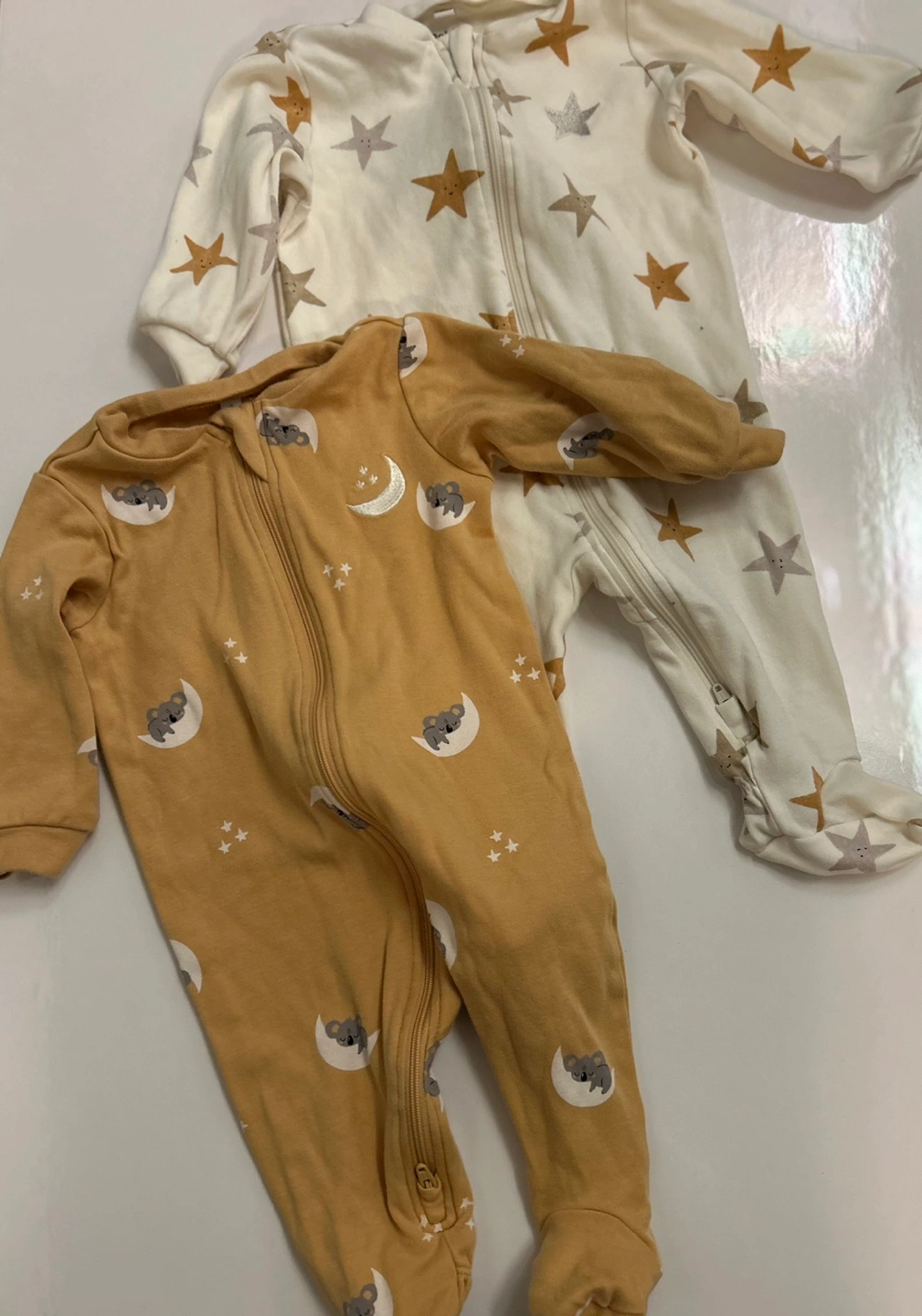 Two adorable Pekkle baby sleepers. One features a cream background with gold stars. The other is mustard yellow with koalas on moons. Both are long-sleeved with double zippers.